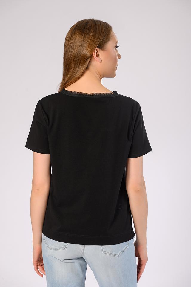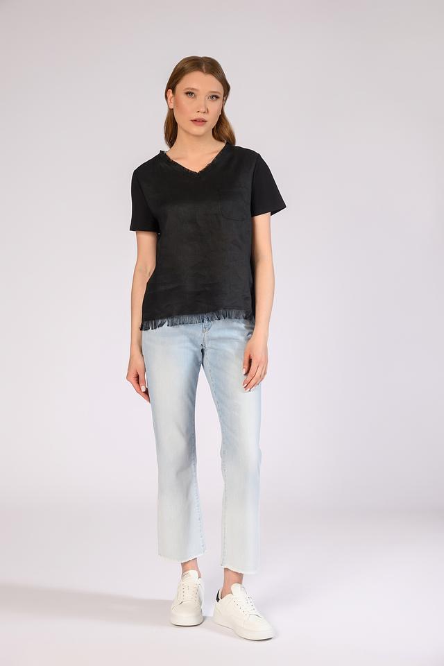 Чёрная блуза Marc Cain из хлопка с эластаном, украшенная бахромой по краю. Модель имеет V-образный вырез и короткие рукава, что делает её идеальным выбором для создания стильного и комфортного образа. Состав: хлопок 95%, эластан 5%