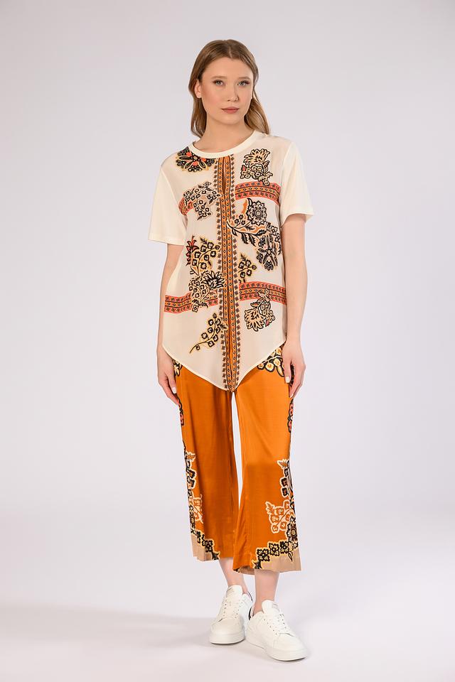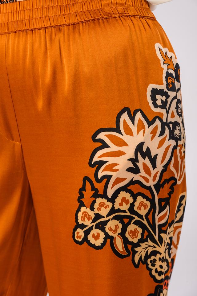 Брюки имеют оранжевый цвет и украшены эффектным цветочным принтом, выполненным в бежевых, черных и коричневых тонах. Широкий эластичный пояс обеспечивает комфортную посадку по фигуре, а свободный крой штанин создает легкий и непринужденный силуэт.
