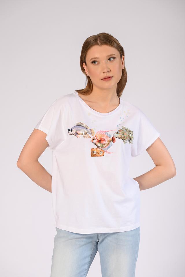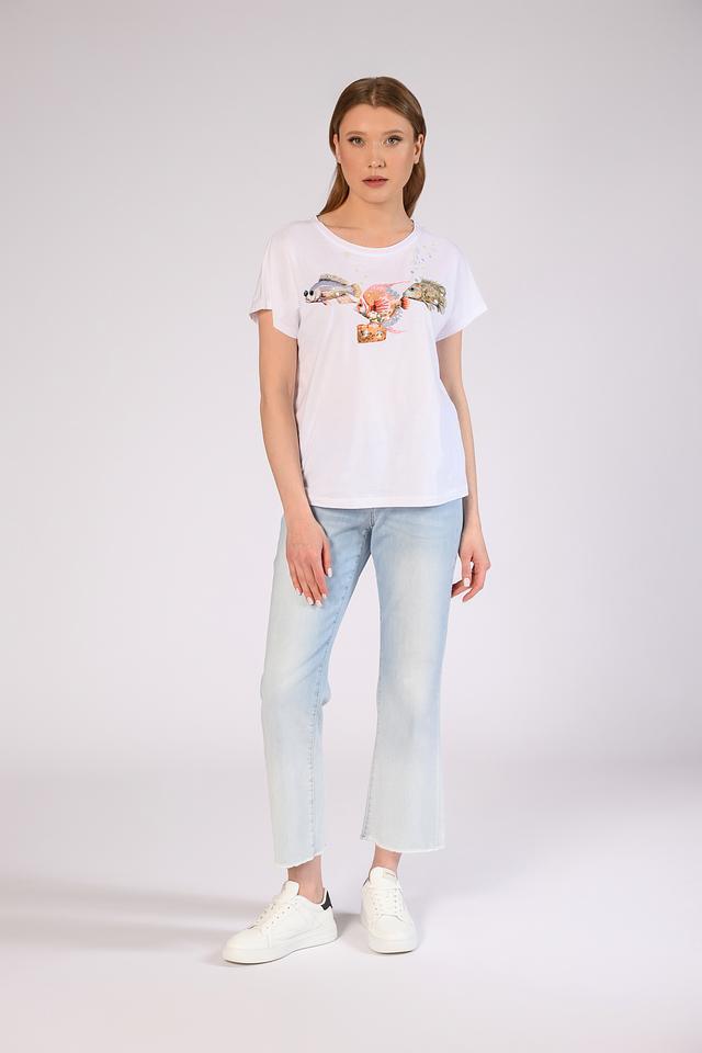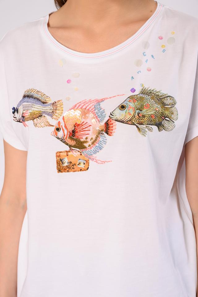 Белая футболка Marc Cain с ярким принтом рыбок и надписями. Изготовлена из 100% хлопка, обеспечивающего комфорт и воздухопроницаемость. Стильный и оригинальный выбор для повседневного образа. Состав: хлопок 100%