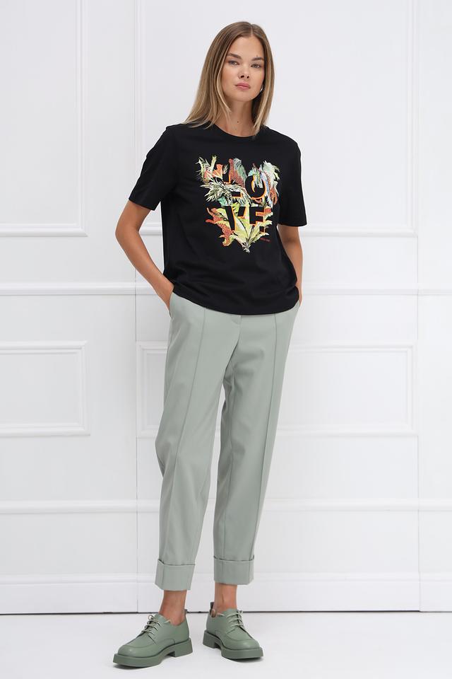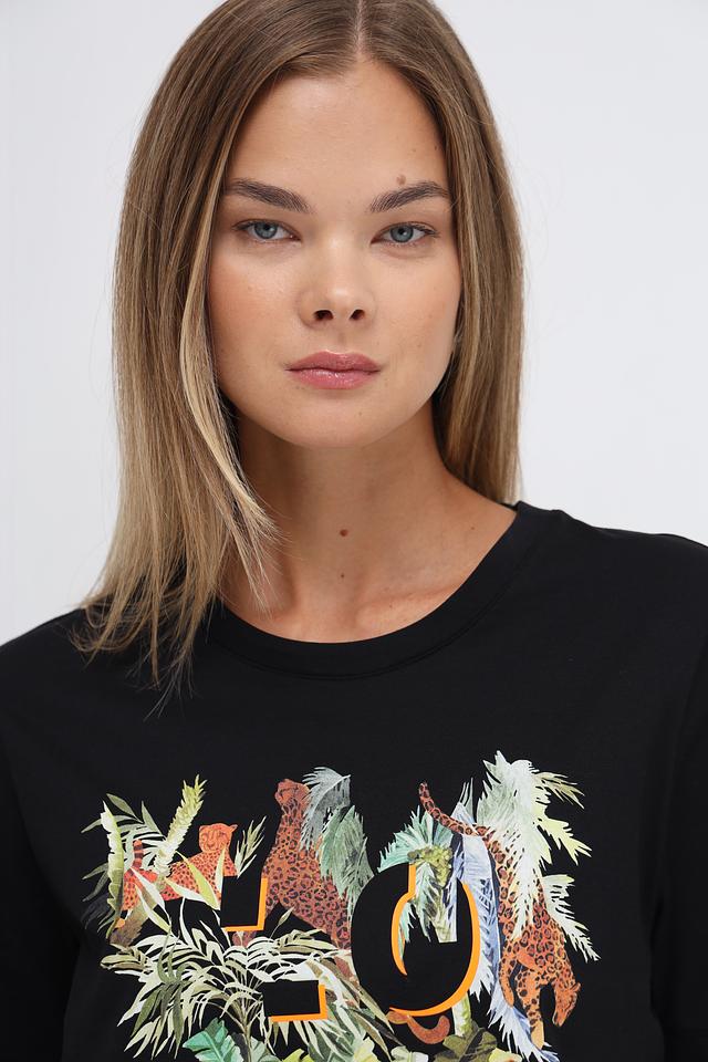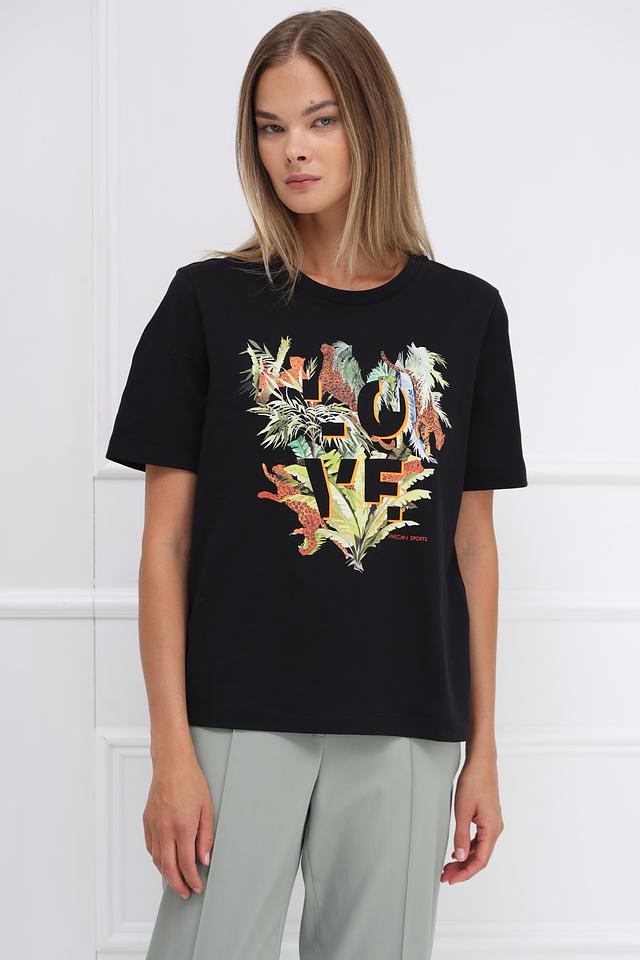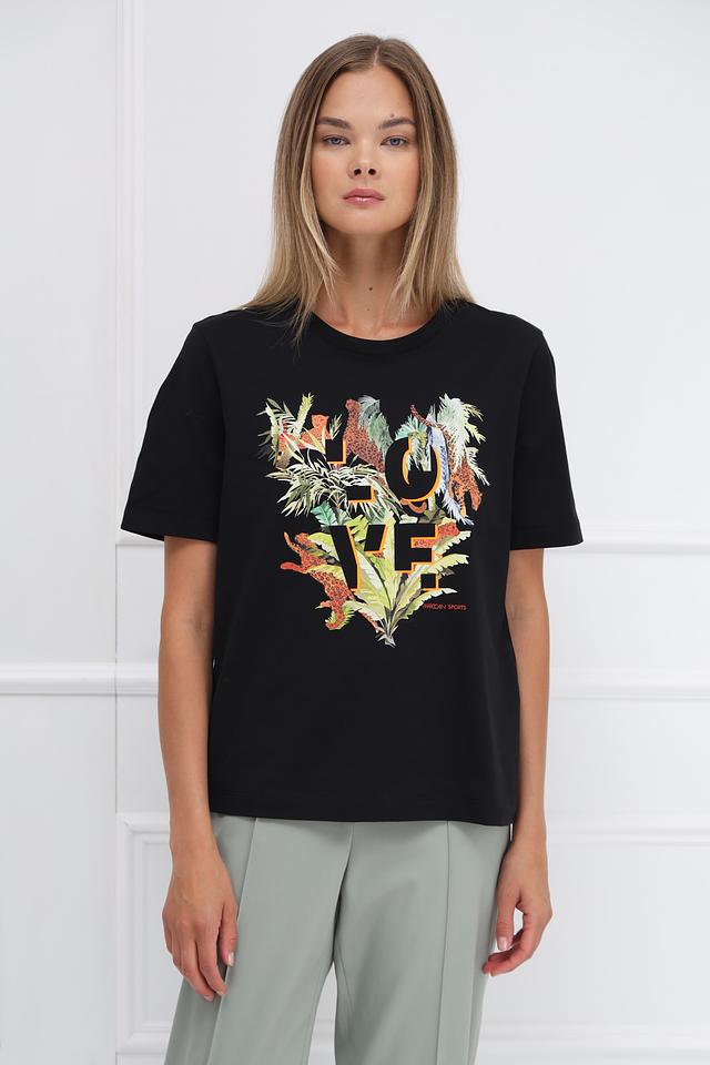 Чёрная футболка Marc Cain Sports с ярким цветочным принтом. Изготовлена из 100% хлопка, обеспечивая комфорт и воздухопроницаемость. Стильный крой и оригинальный дизайн делают эту футболку отличным выбором для повседневного образа. Состав: хлопок 100%