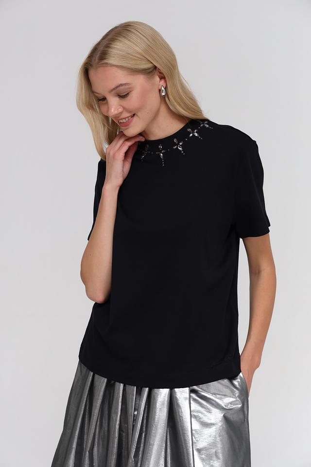 Особенностью данной модели является декор в виде кристаллов, расположенных вокруг горловины, что придает ей изысканность и привлекательность. Футболка имеет прямой крой и короткие рукава, обеспечивающие свободу движений.