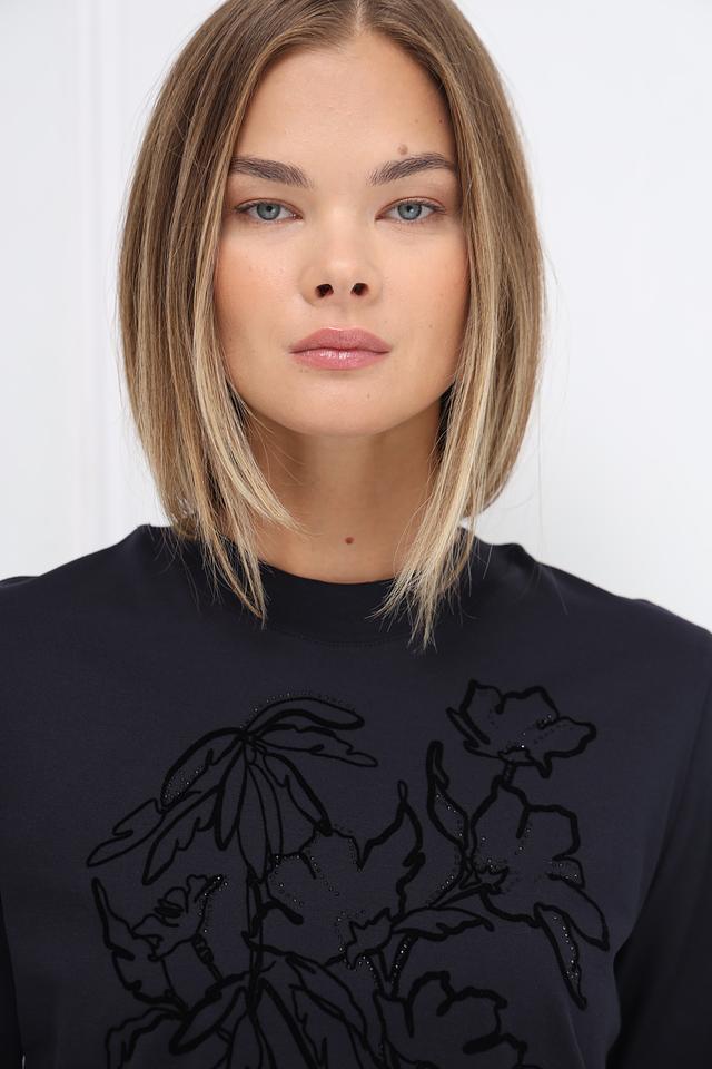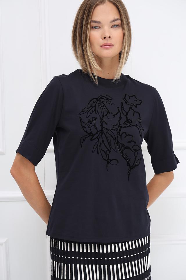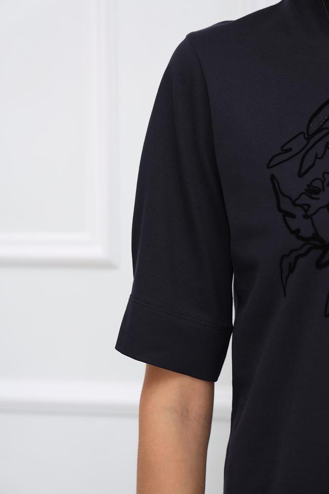 Женская футболка Marc Cain чёрного цвета с оригинальным цветочным принтом. Изготовлена из 100% хлопка, обеспечивающего комфорт и воздухопроницаемость. Стильный и лаконичный дизайн делает эту футболку универсальным элементом гардероба. Состав: хлопок 100%