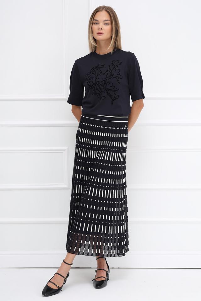 Основным акцентом футболки является оригинальный цветочный принт, выполненный в той же цветовой гамме, что и сама футболка, что придает ей изысканность и элегантность. Принт расположен на лицевой стороне изделия.