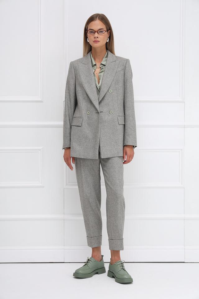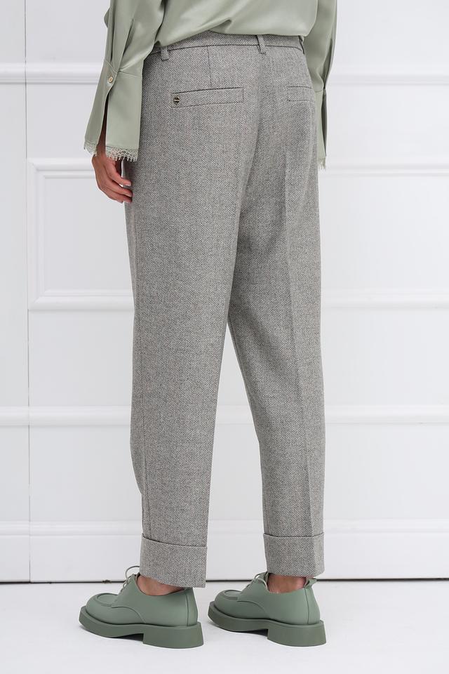 Брюки имеют прямой крой, который визуально вытягивает силуэт, и зауженный низ, придающий им современный вид. Складки на талии обеспечивают комфортную посадку, а манжеты добавляют изысканности.