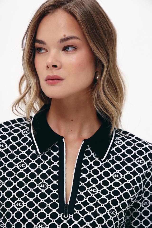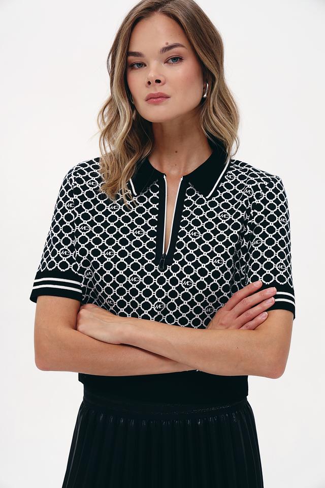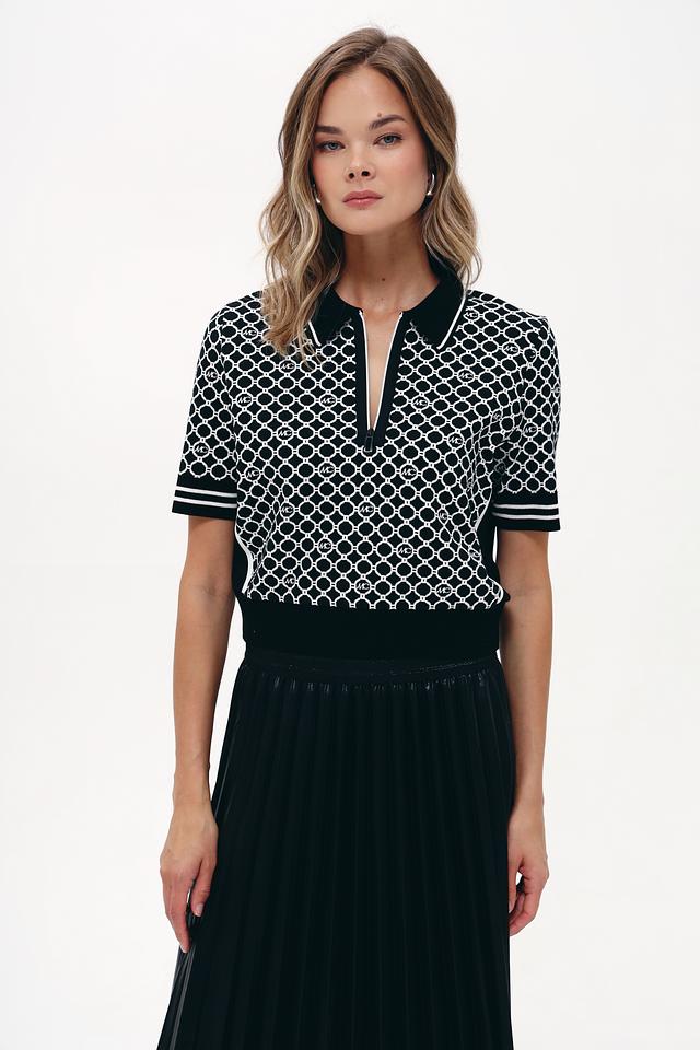 Модель имеет короткий рукав и классический воротник поло, который украшен повторяющимся логотипом бренда. Чёрный цвет пуловера делает его универсальным и легко сочетаемым с различными элементами одежды.