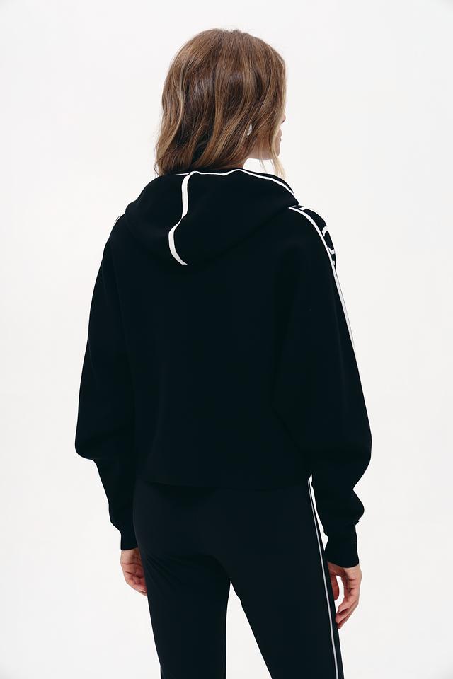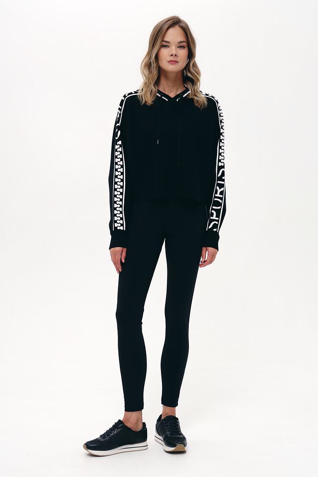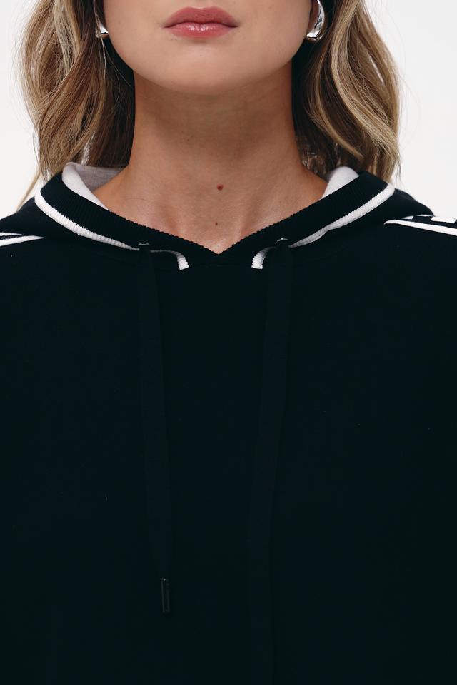 Чёрный пуловер Marc Cain Sports с капюшоном и контрастной отделкой. Модель выполнена из мягкой вискозы с добавлением полиэстера, обеспечивающей комфорт и удобство в носке. Стильный спортивный дизайн. Состав: вискоза 72%, полиэстер 28%
