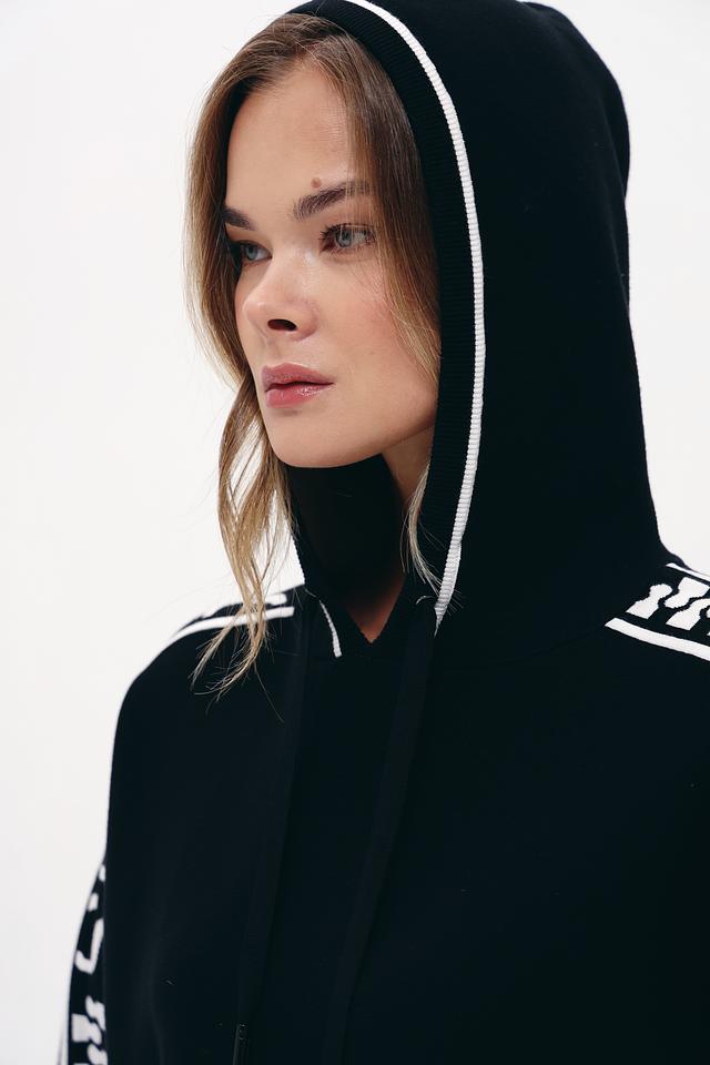 Пуловер имеет удобный капюшон и свободный крой, что делает его идеальным для активного образа жизни. Контрастная белая полоса с логотипом бренда проходит по рукавам и вдоль центральной части, добавляя динамичности и спортивного стиля.