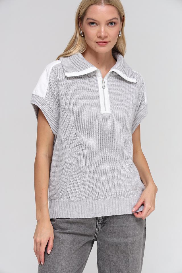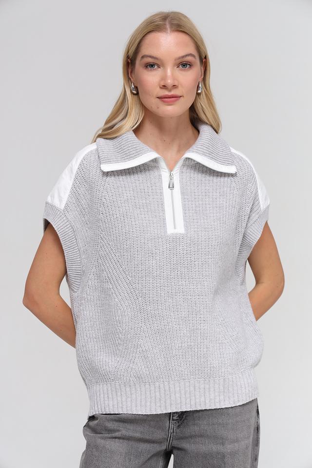 Серый вязаный жилет Marc Cain с воротником и молнией. Изготовлен из высококачественной шерсти, вискозы, кашемира и полиамида, обеспечивающих комфорт и тепло. Состав: шерсть 35%, вискоза 30%, кашемир 20%, полиамид 15%