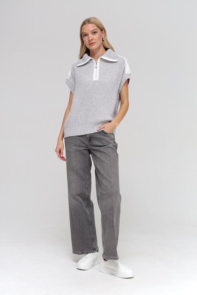 Модель имеет воротник и застежку-молнию, что позволяет регулировать степень прилегания и создавать различные образы. Жилет без рукавов, что делает его идеальным для ношения поверх рубашек, футболок или блузок.