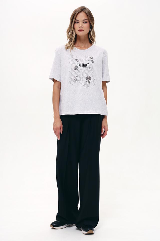 Цвет футболки – светло-серый меланж, который легко сочетается с различными элементами гардероба. Круглый вырез горловины и короткие рукава делают эту футболку идеальным выбором для повседневной носки в теплую погоду.