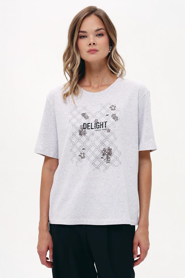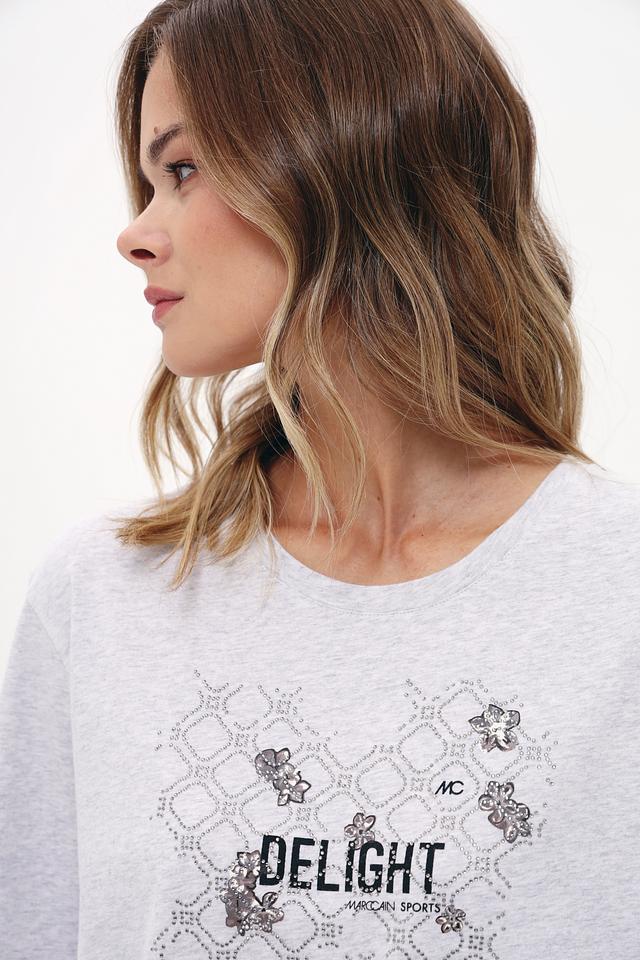 Стильная футболка Marc Cain Sports серого цвета с оригинальным принтом "Delight" станет отличным дополнением к вашему гардеробу. Изготовлена из 100% хлопка, обеспечивая комфорт и удобство в носке. Состав: хлопок 100%