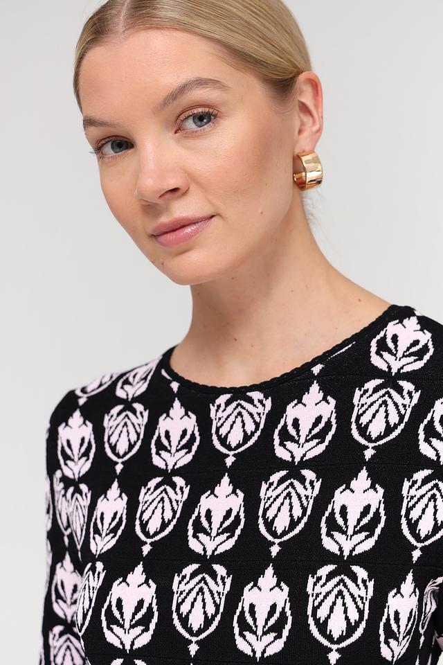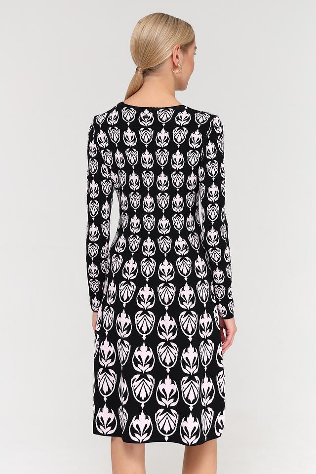 Особенностью этого платья является его уникальный черно-белый принт с геометрическим узором. Этот принт добавляет платью изысканности и делает его запоминающимся. Состав ткани: 88% вискоза, 12% полиэстер.