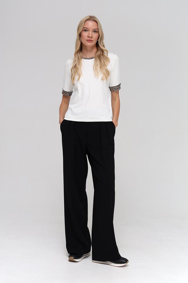 Брюки имеют прямой крой и широкие штанины, что обеспечивает свободу движений и комфорт в носке. Высокая посадка визуально удлиняет ноги и подчеркивает талию. На брюках предусмотрены боковые карманы, добавляющие функциональности.