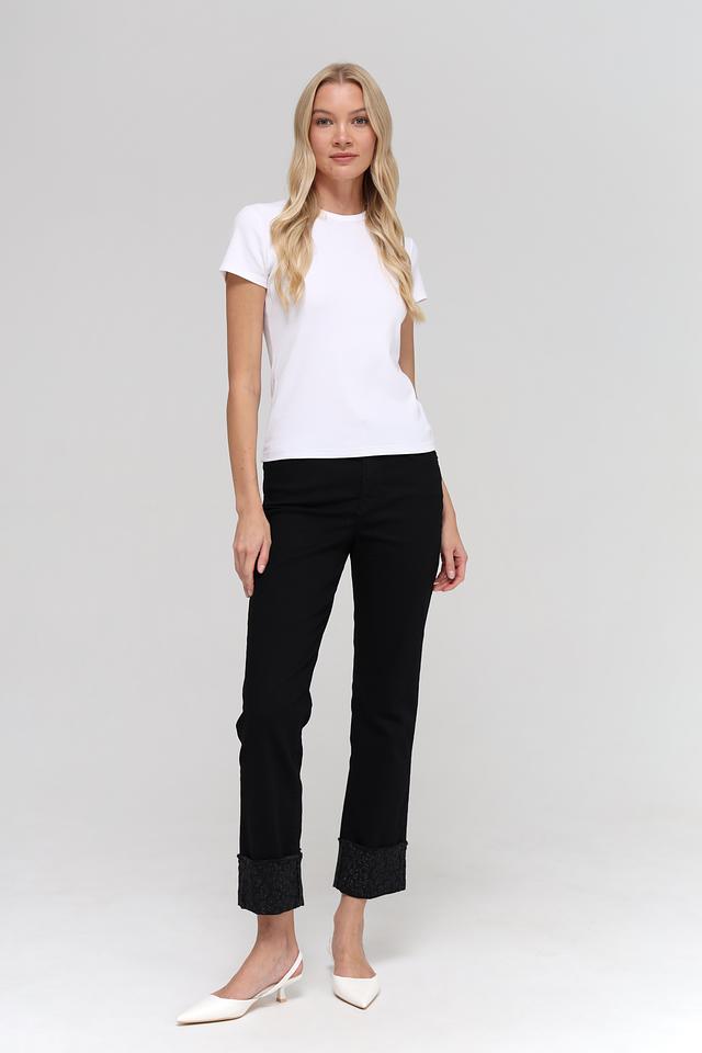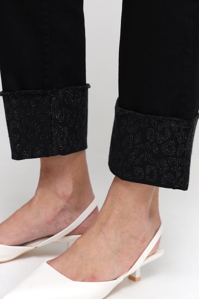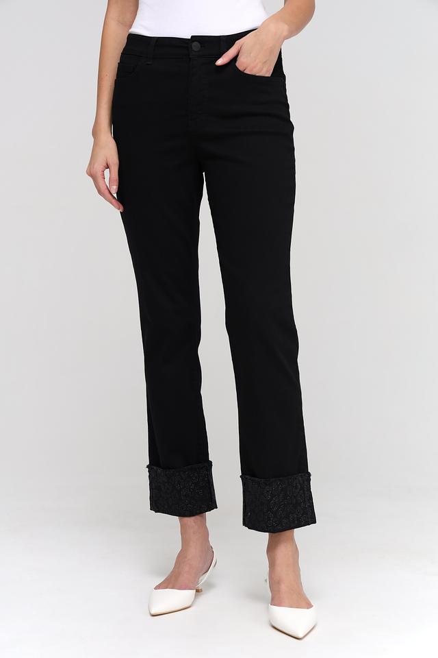 Джинсы имеют прямой крой и стандартную посадку по талии. Особый акцент сделан на декоративные элементы из кружева, расположенные на нижней части брюк, что придает образу изысканность и женственность. Ткань состоит из 91% хлопка, 7% эластомультиэстера и 2% эластана, обеспечивая приятные тактильные ощущения и хорошую посадку по фигуре.