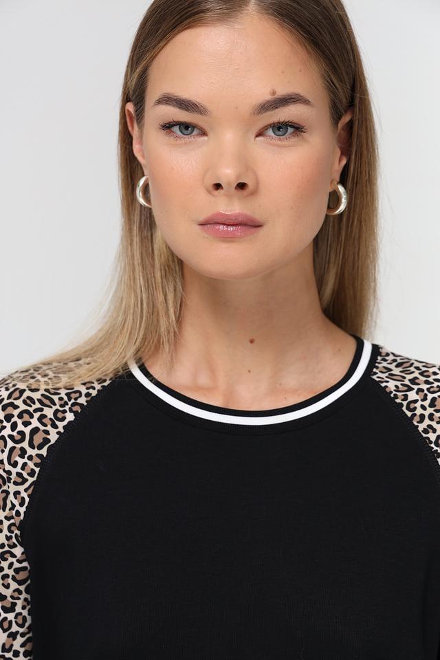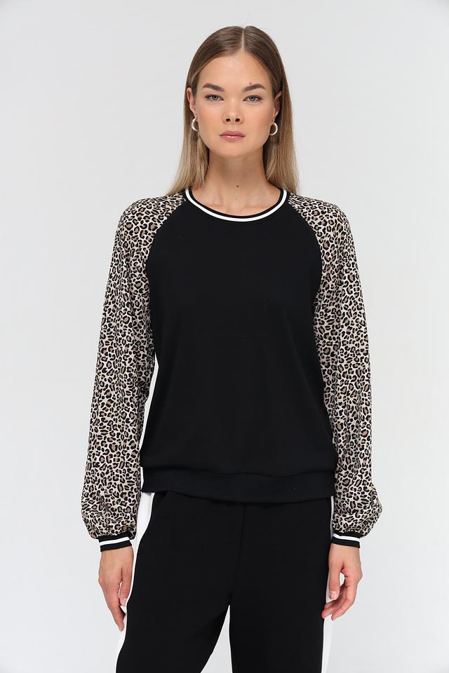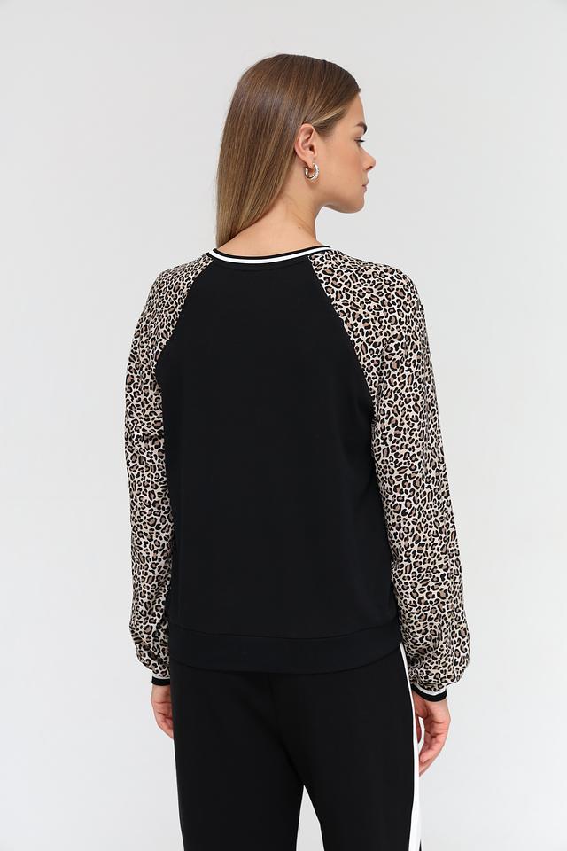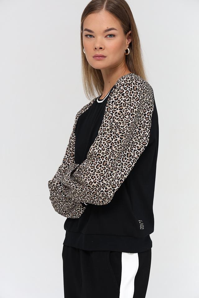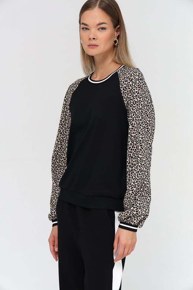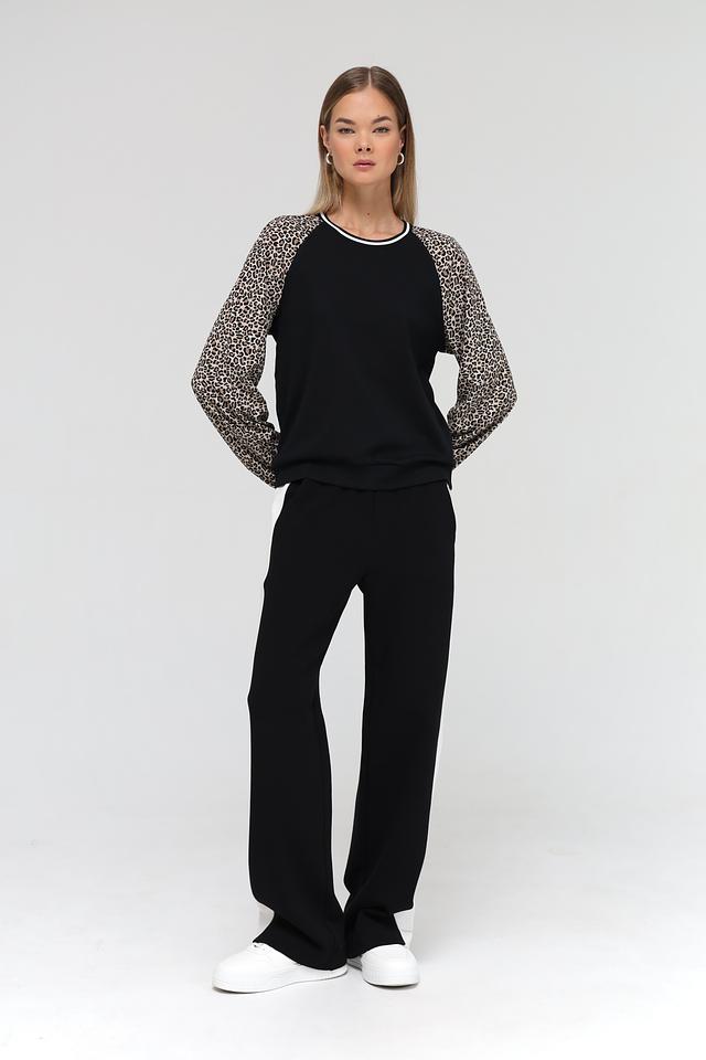 Основной цвет пуловера – чёрный, что делает его универсальным элементом гардероба. Рукава выполнены с ярким леопардовым принтом, добавляя образу динамичности и индивидуальности. Белая полоска на горловине и манжетах рукавов подчеркивает современный дизайн модели.
