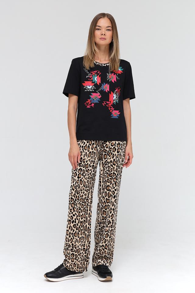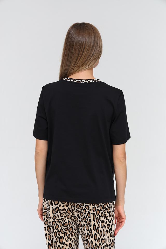 Футболка имеет прямой крой, короткие рукава и круглый вырез горловины, отделанный леопардовым принтом. Изготовлена из высококачественного 100% хлопка, что обеспечивает приятные ощущения при носке и хорошую воздухопроницаемость.