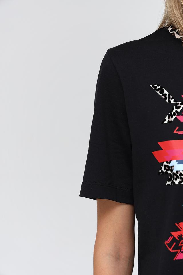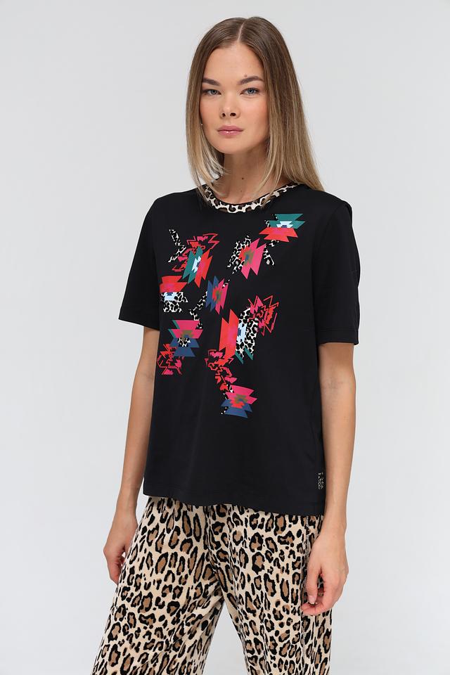 Чёрная футболка Marc Cain с ярким геометрическим принтом. Изготовлена из 100% хлопка, обеспечивающего комфорт и воздухопроницаемость. Стильный крой и оригинальный дизайн делают эту футболку отличным выбором для повседневного образа. Состав: хлопок 100%