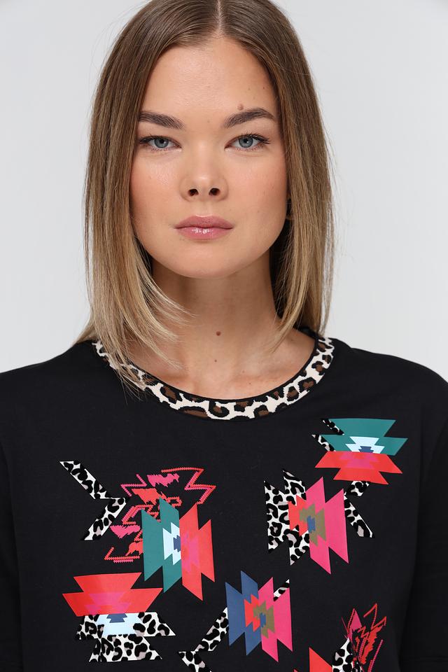 Особенностью данной модели является яркий и необычный принт в виде геометрических фигур, выполненных в оттенках красного, бирюзового и с леопардовым узором. Принт расположен на лицевой стороне футболки, добавляя ей индивидуальности.