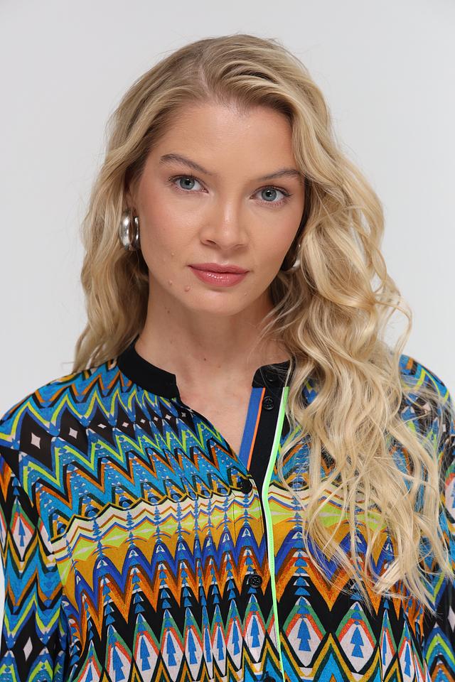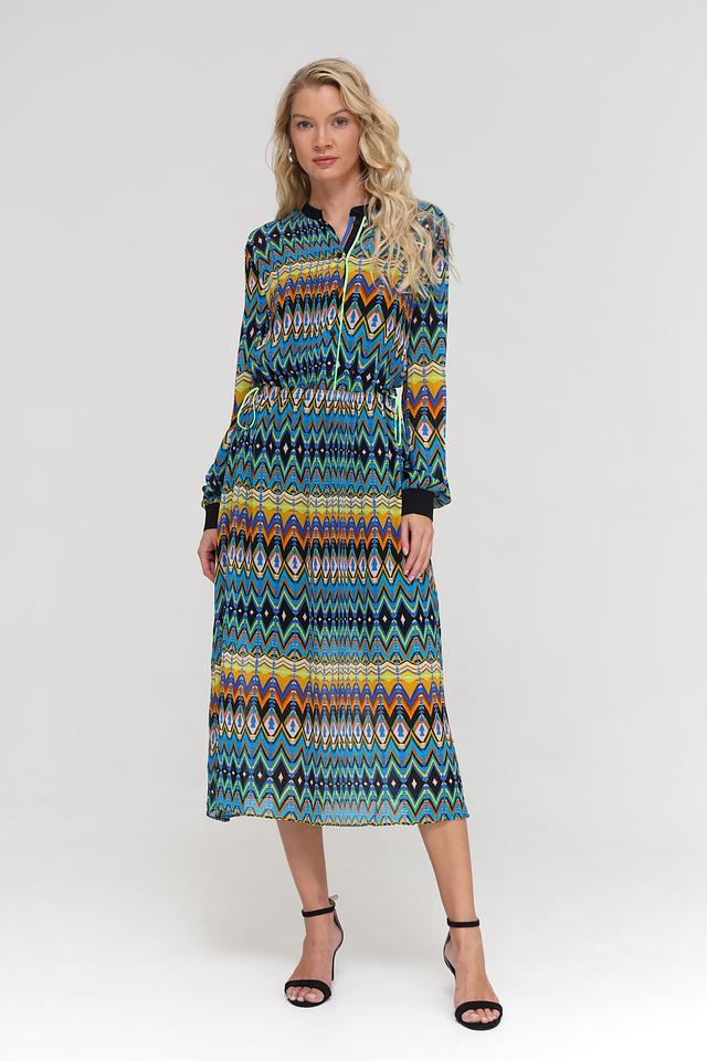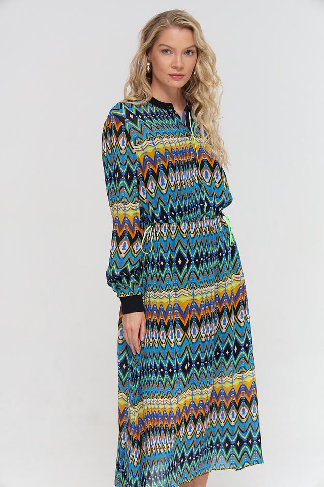 Платье имеет длину миди, длинные рукава с манжетами и воротник-стойку с V-образным вырезом. Талия подчеркнута приталенным кроем и поясом, что позволяет создать женственный силуэт. Яркий геометрический принт делает это платье уникальным и привлекательным.