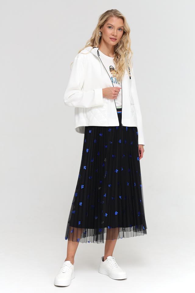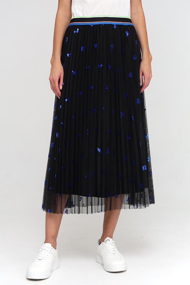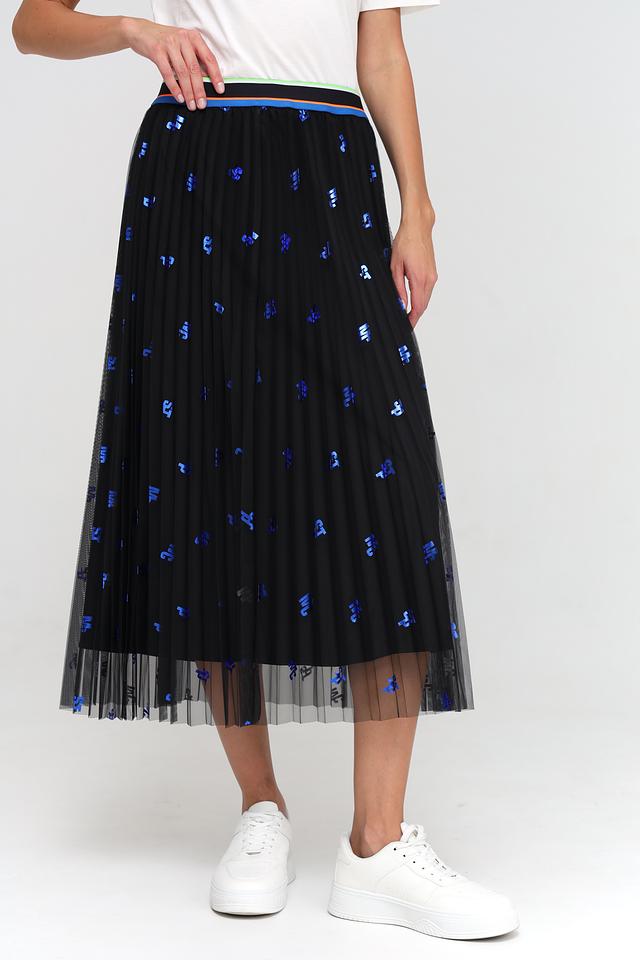 Юбка имеет классический черный цвет, который гармонично сочетается с яркими синими принтами, добавляющими образу оригинальности. Плиссированный крой создает эффект легкости и динамики, а эластичный пояс обеспечивает удобную посадку по фигуре.