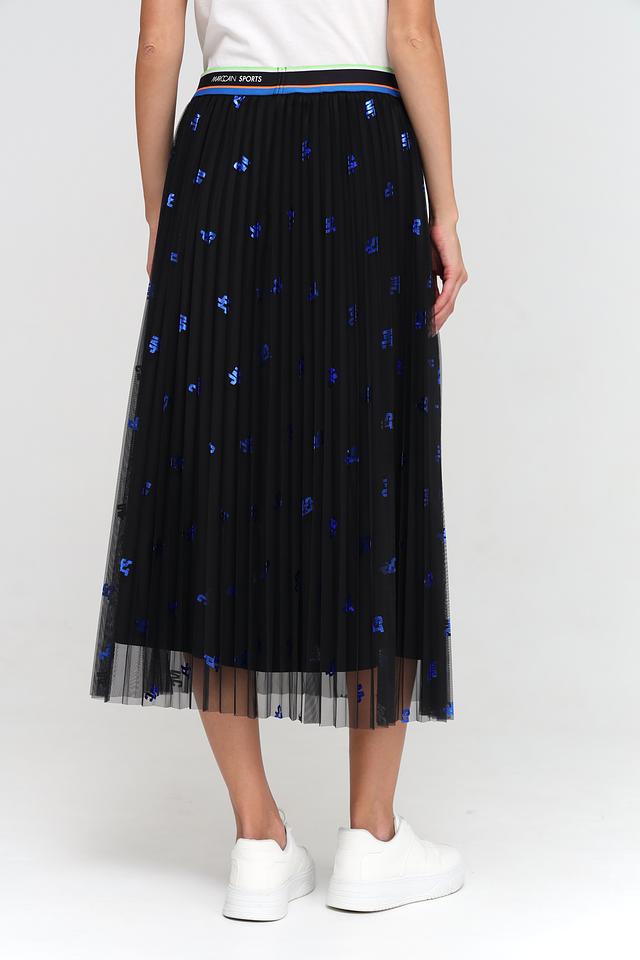 Юбка Marc Cain Sports черного цвета, украшенная синими принтами, выполнена из 100% полиэстера. Модель плиссированного кроя, средней длины, с эластичным поясом. Состав: полиэстер 100%
