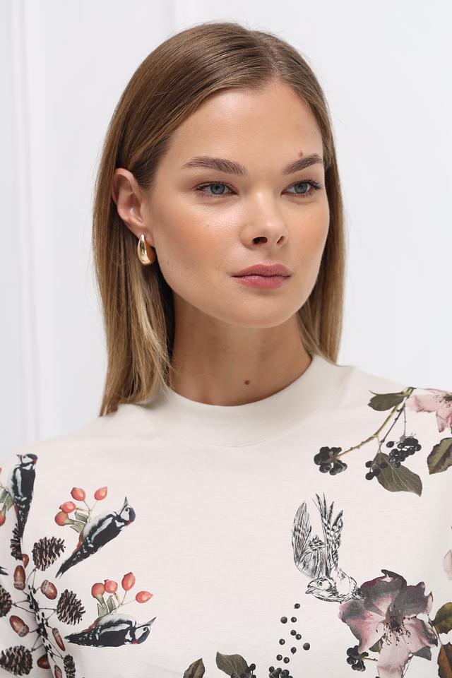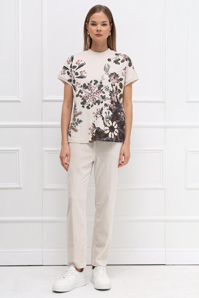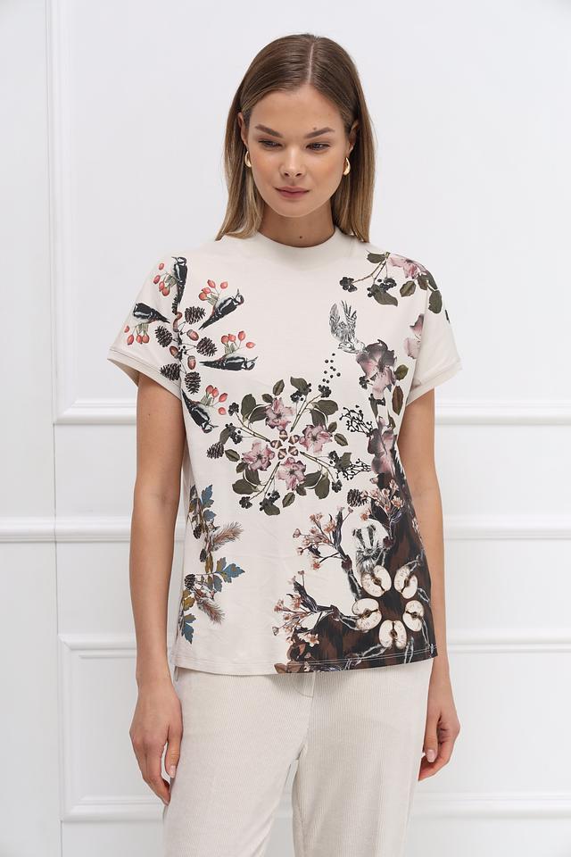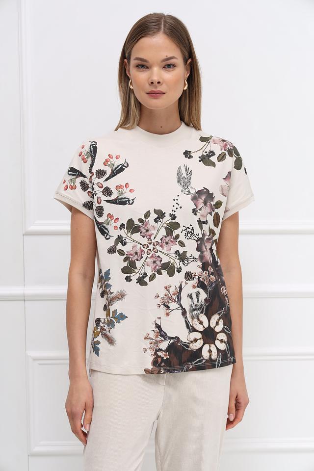 Основной цвет футболки – кремовый, который служит идеальным фоном для красочного цветочного принта. Дизайн украшен изображениями птиц и разнообразных цветов, создавая неповторимый и запоминающийся образ.