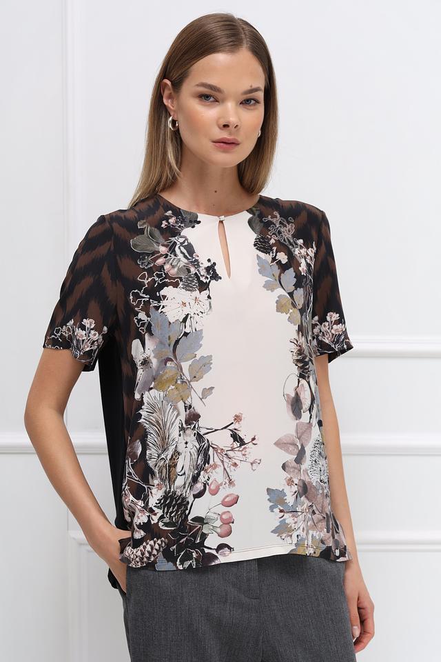 Блуза имеет свободный крой, который не сковывает движений и позволяет создать расслабленный образ. Особенностью модели является яркий цветочный принт, который придает ей неповторимый шарм и женственность. Вырез горловины оформлен небольшим V-образным разрезом.
