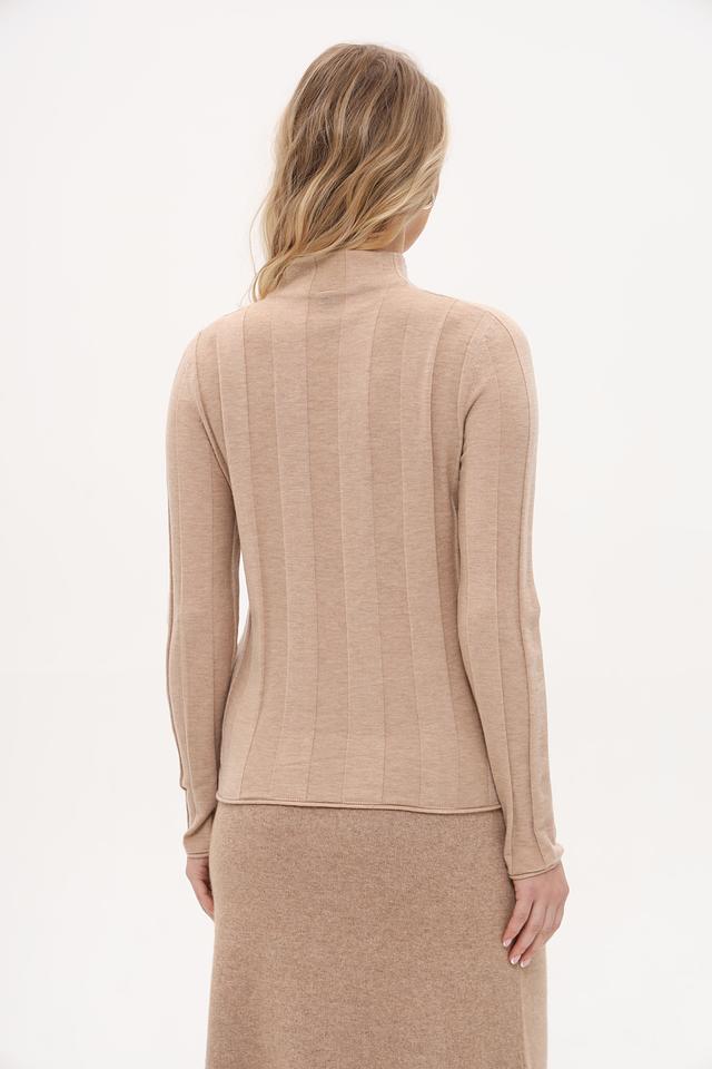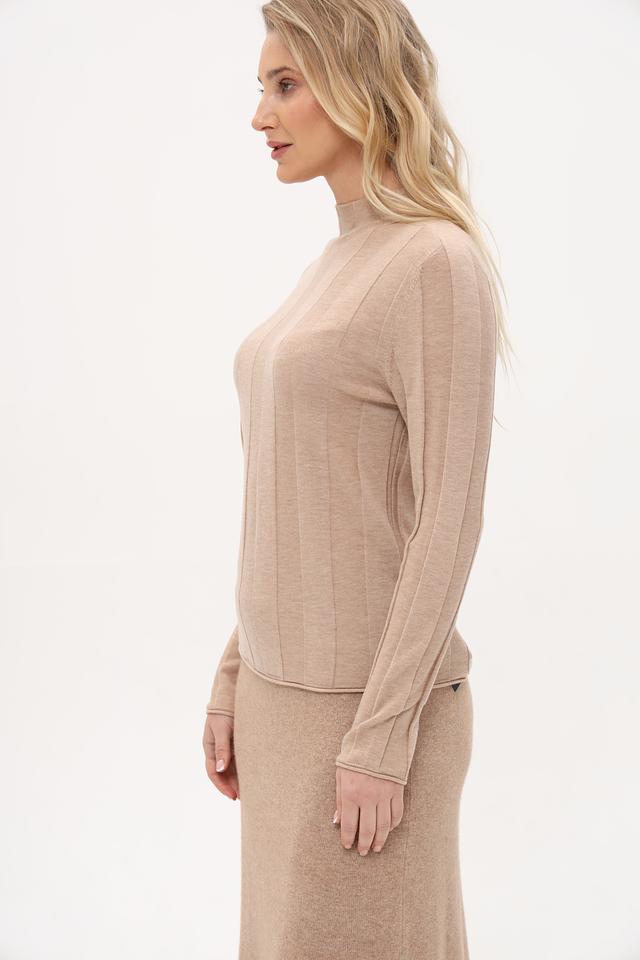 Пуловер имеет прямой крой и воротник-стойку, что делает его универсальным для создания различных образов. Вертикальная текстура вязки визуально вытягивает силуэт и добавляет изысканности. Модель идеально подходит для повседневной носки и особых случаев.