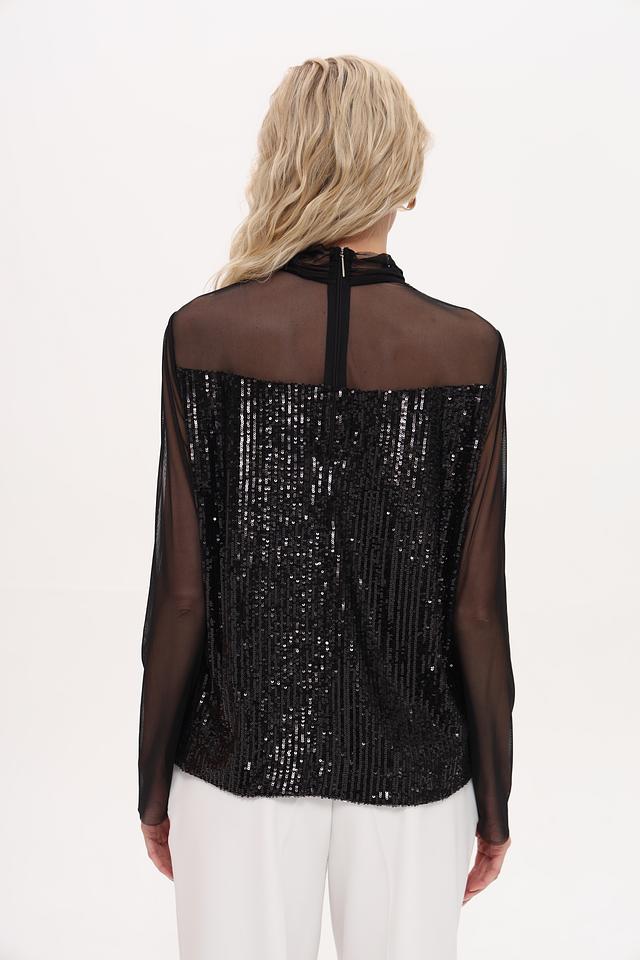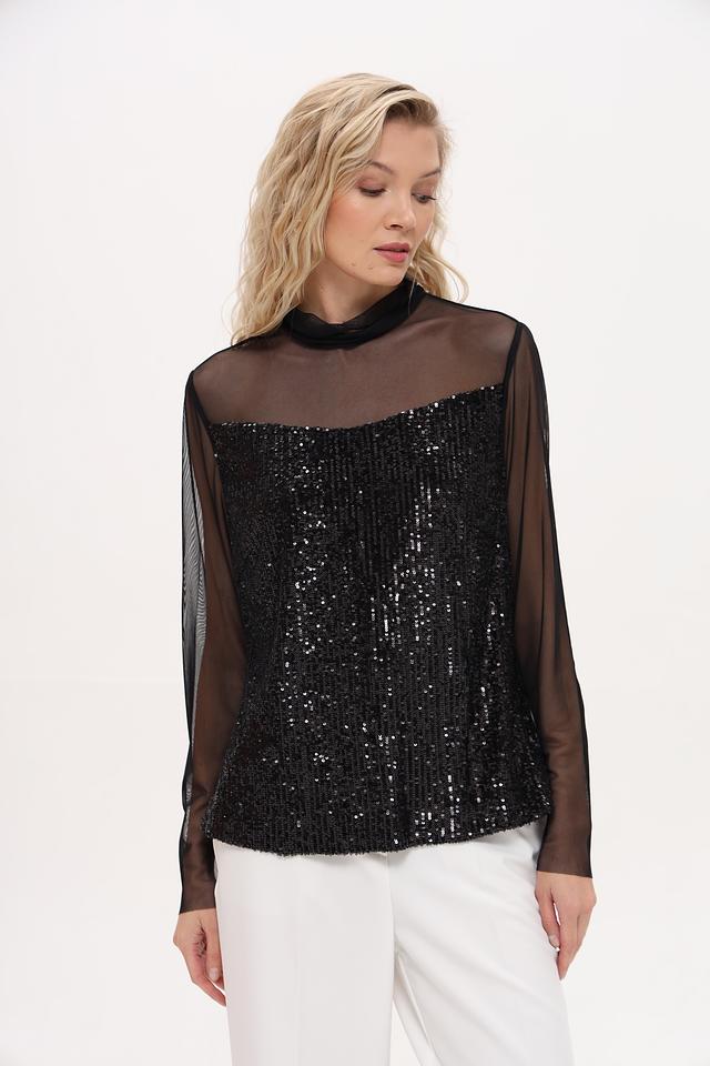 Чёрная блуза Marc Cain с пайетками и полупрозрачными рукавами из сетки – эффектный выбор для создания вечернего образа. Модель выполнена из полиэстера с добавлением эластана, что обеспечивает комфорт и свободу движений. Состав: полиэстер 92%, эластан 8%
