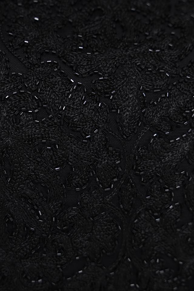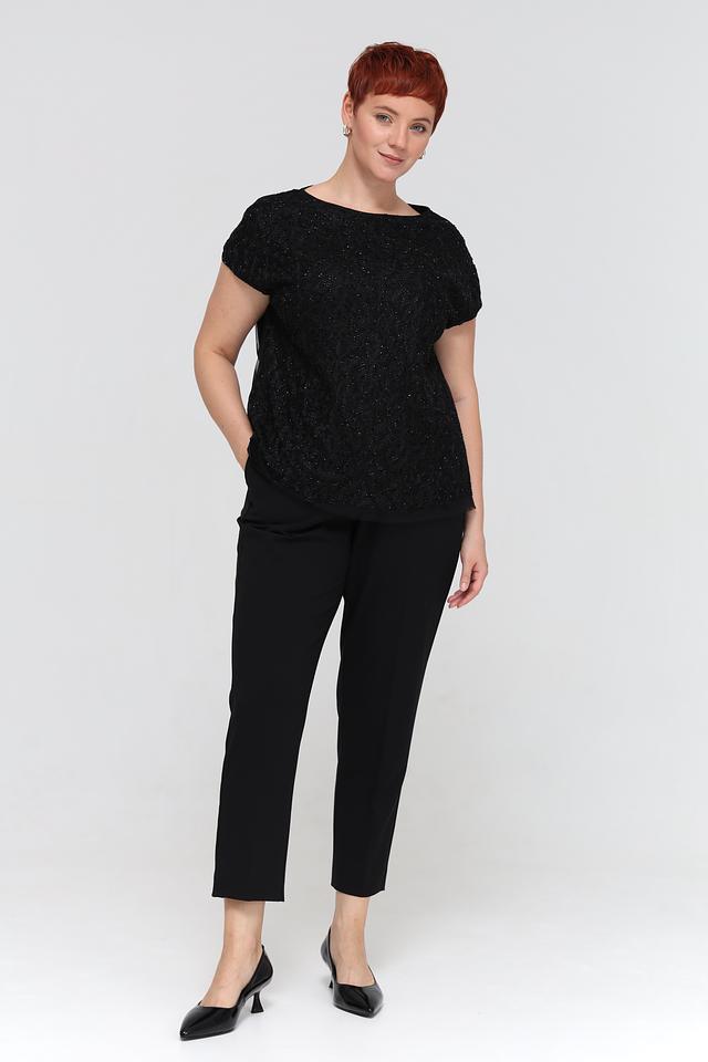Блуза имеет классический чёрный цвет и украшена изысканной вышивкой, придающей ей особый шарм. Округлый вырез горловины и короткие рукава делают её универсальной для различных случаев.