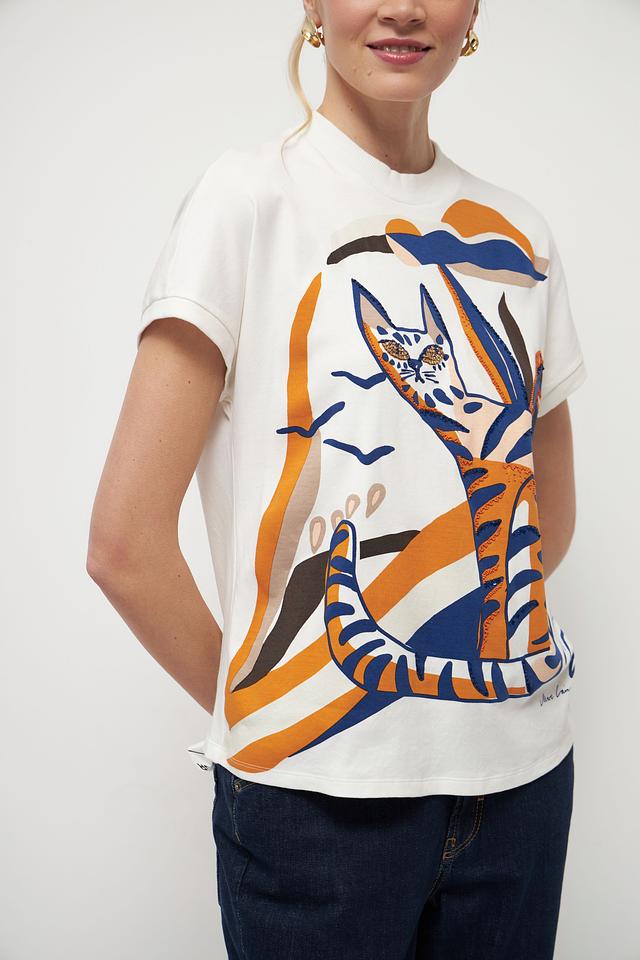 Белая футболка Marc Cain с ярким принтом кота и тропических листьев. Изготовлена из 100% хлопка, обеспечивающего комфорт и воздухопроницаемость. Стильный и оригинальный дизайн для создания неповторимого образа. Состав: хлопок 100%