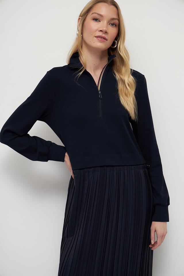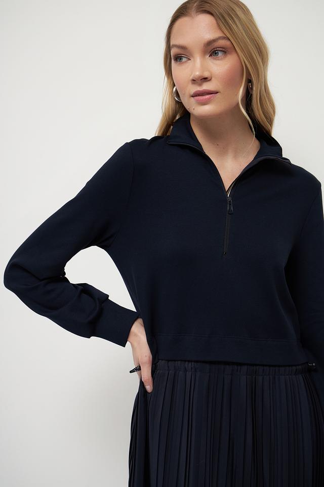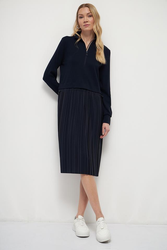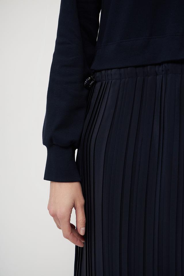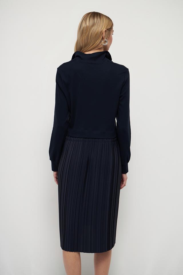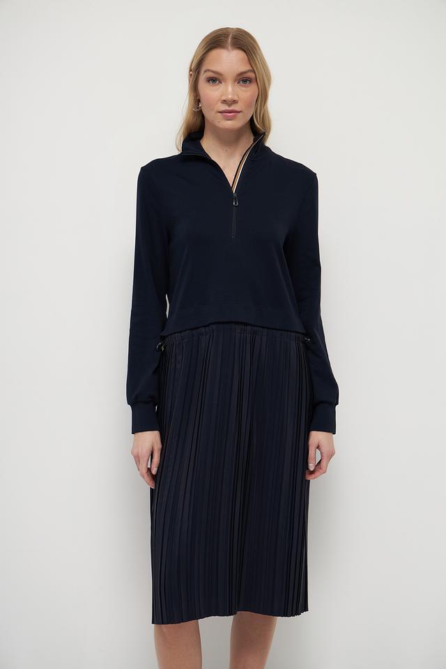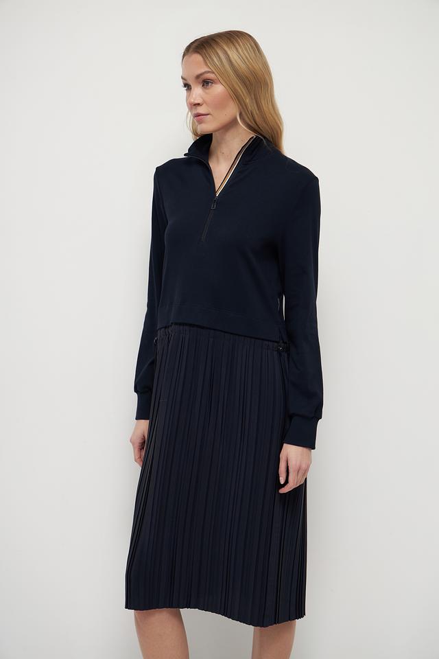 Это платье от Marc Cain – идеальный выбор для создания современного и утонченного образа. Верх платья выполнен из гладкого трикотажа тёмно-синего цвета, а юбка – из плиссированной ткани, создающей эффект движения.