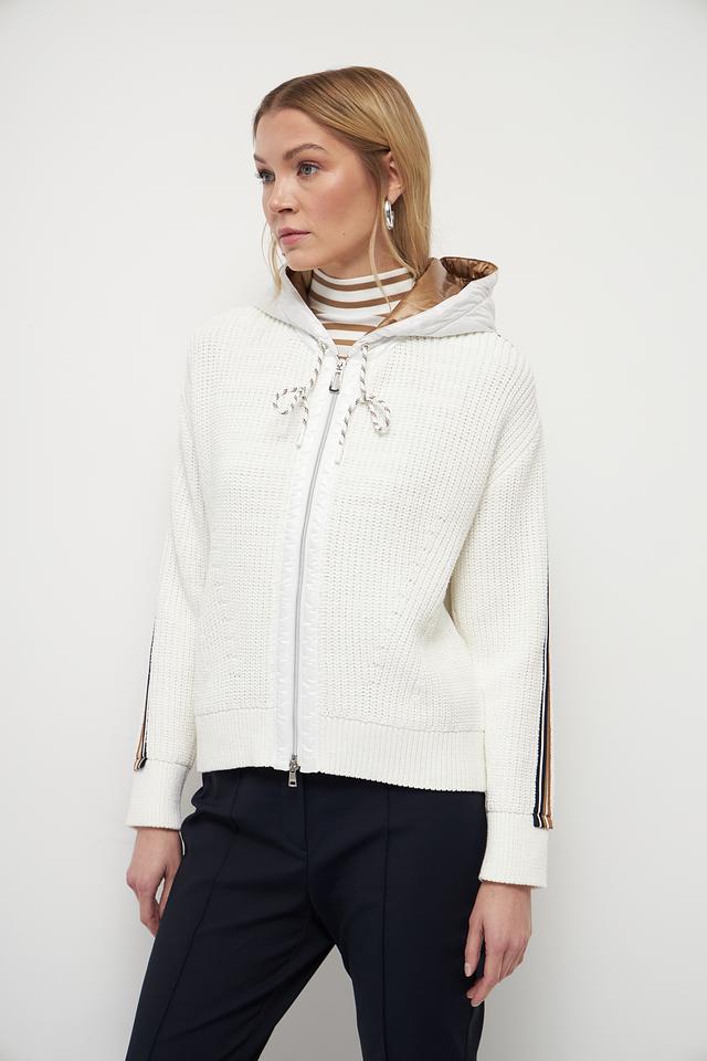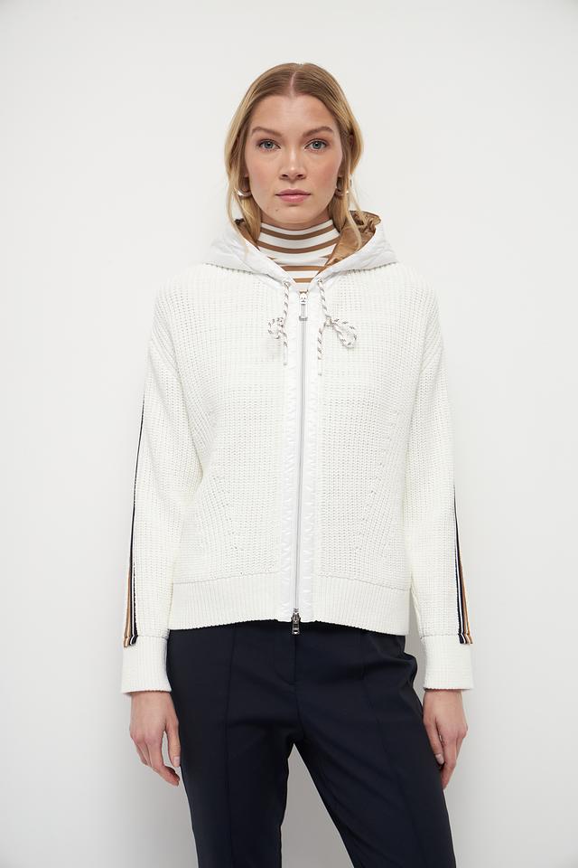 Белый жакет Marc Cain из хлопка с полиэстером, выполненный с декоративными полосками и капюшоном. Застежка – молния. Состав: 90% хлопок, 10% полиэстер. Состав: хлопок 90%, полиэстер 10%