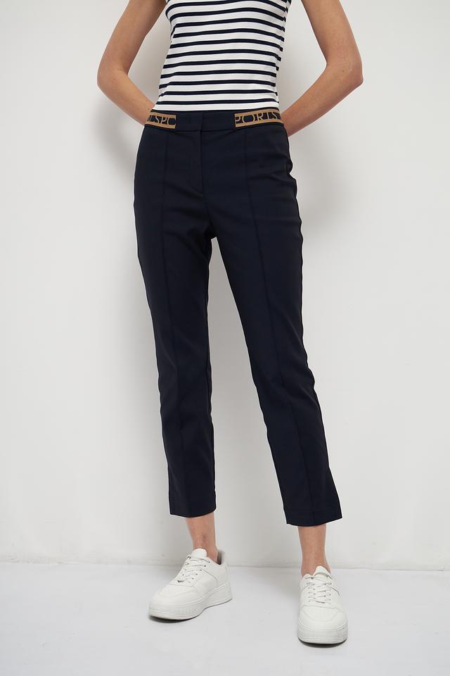 Брюки имеют прямой крой и слегка зауженный книзу силуэт, что придает им изысканность. Модель дополнена аккуратными вытачками, подчеркивающими фигуру. Пояс украшен декоративной текстильной лентой с логотипом бренда в золотистом цвете, что добавляет брюкам особый шарм.