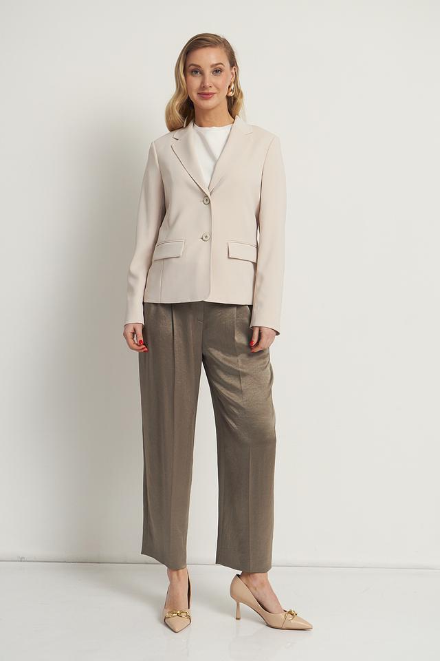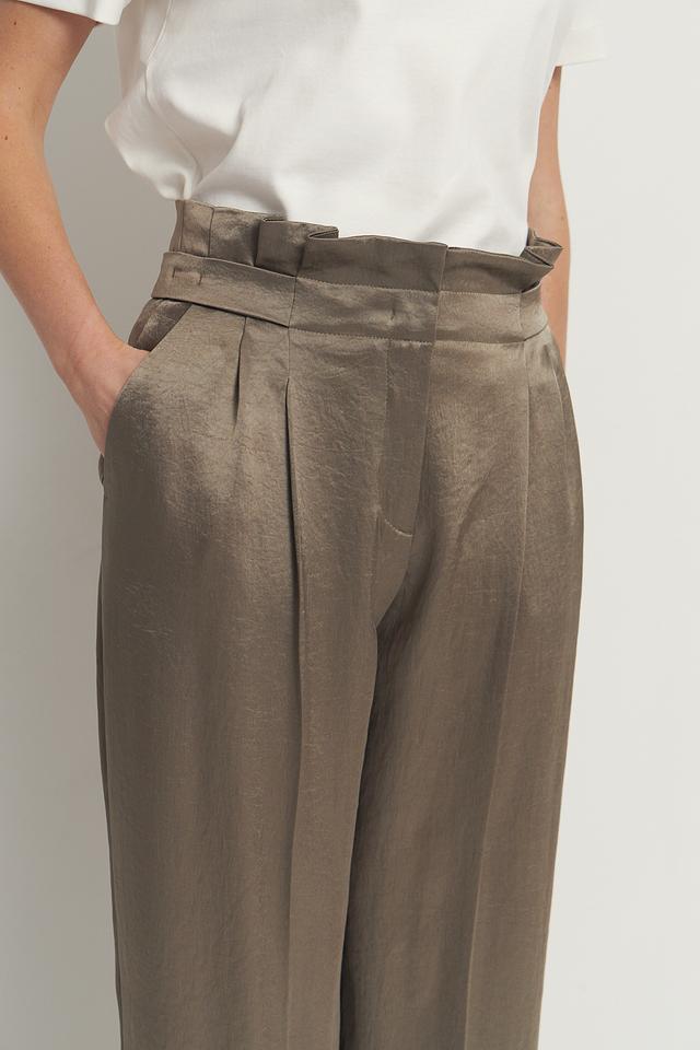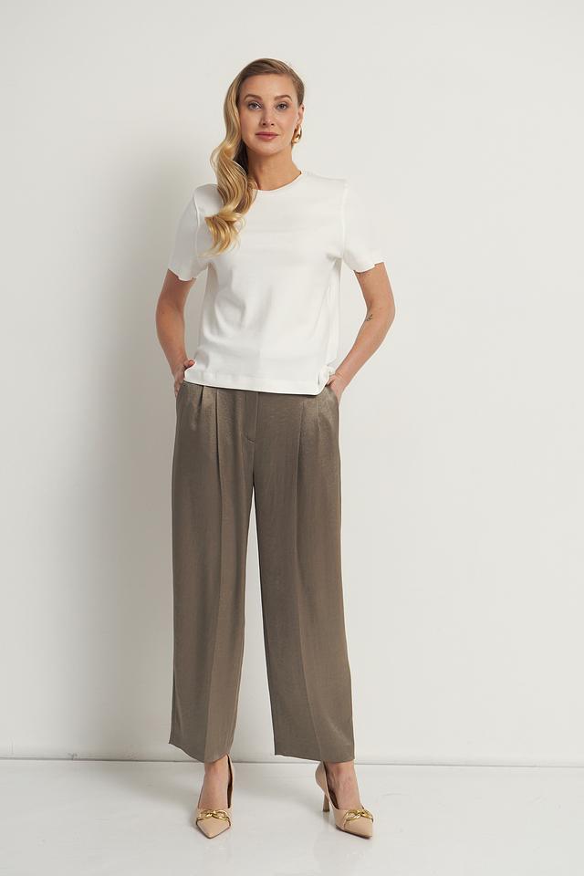 Брюки имеют прямой крой и широкие штанины в стиле палаццо, создающие элегантный и современный образ. Высокая посадка подчеркивает талию и визуально удлиняет ноги. Передняя часть брюк оформлена аккуратными складками, добавляющими объём и текстуру.