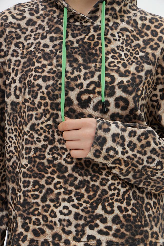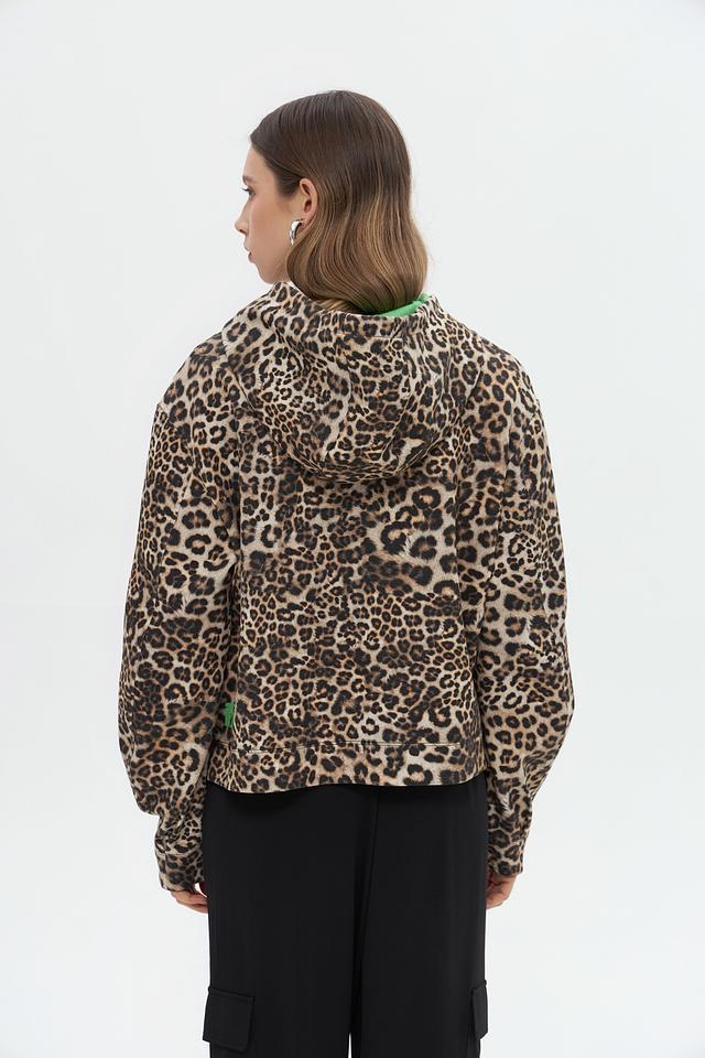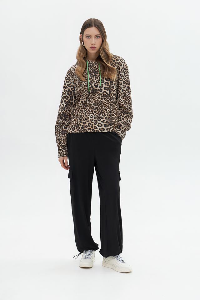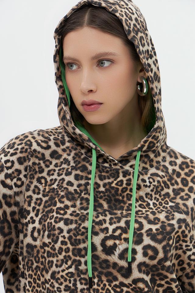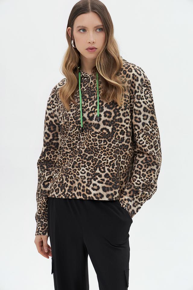 Женский пуловер Marc Cain в леопардовый принт с капюшоном и яркими зелёными шнурками. Модель выполнена из мягкого хлопка с добавлением полиэстера и эластана для комфорта и сохранения формы. Состав: хлопок 82%, полиэстер 14%, эластан 4%