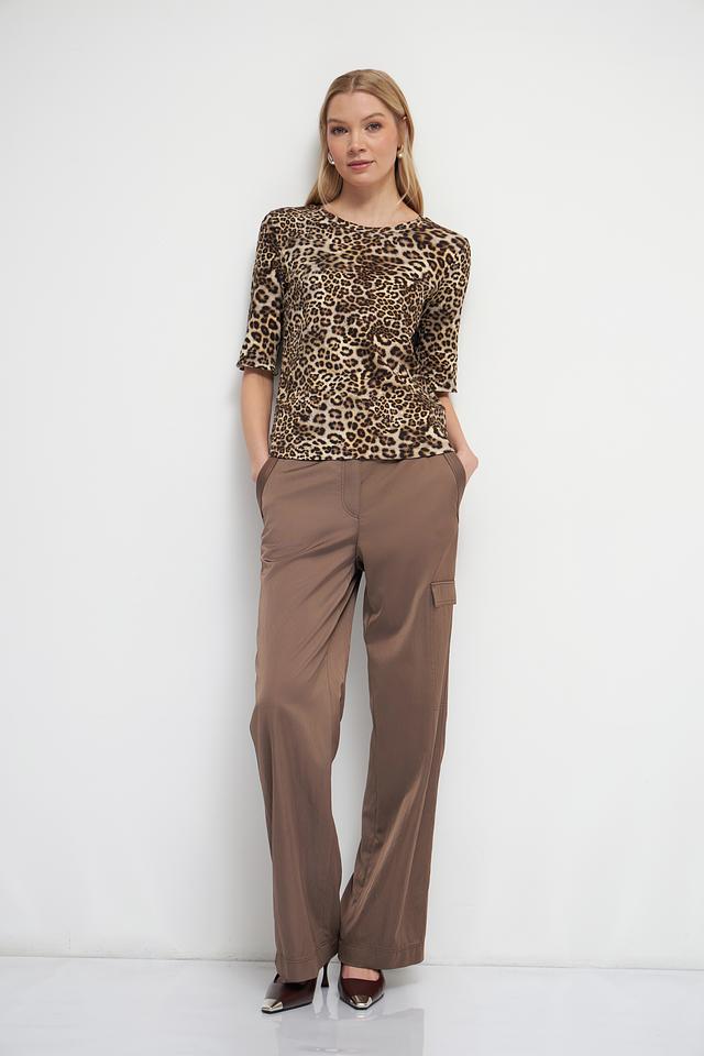 Дизайн футболки выполнен в ярком леопардовом принте, который добавит образу динамичности и индивидуальности. Круглый вырез горловины и короткие рукава делают эту модель универсальной и подходящей для различных случаев.