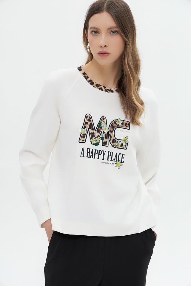 Этот стильный пуловер от Marc Cain выполнен в белом цвете и украшен эффектным принтом с логотипом бренда "MC A HAPPY PLACE". Модель имеет классический крой с длинными рукавами и круглым вырезом горловины.