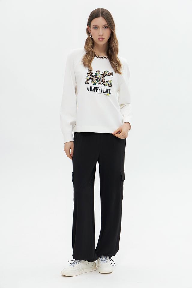 Белый пуловер Marc Cain с ярким принтом "MC A HAPPY PLACE" станет стильным дополнением к вашему гардеробу. Изготовлен из мягкого хлопка с добавлением эластана для комфорта и отличной посадки. Состав: хлопок 95%, эластан 5%