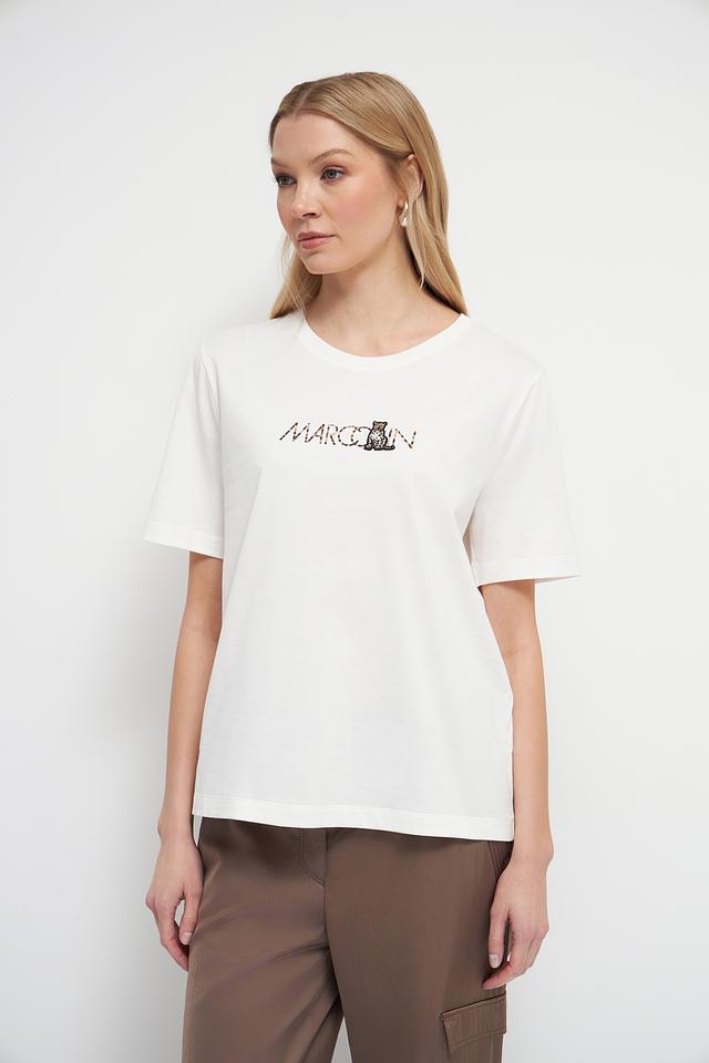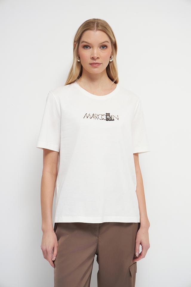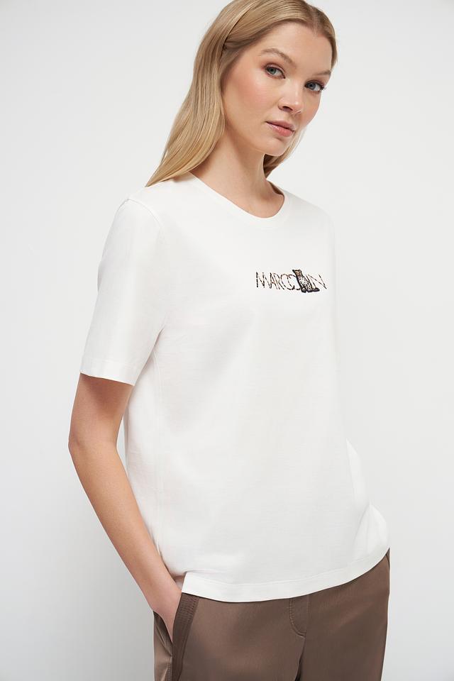 Белая футболка Marc Cain из 100% хлопка с небольшим логотипом бренда. Классический крой и мягкий материал обеспечивают комфорт в повседневной носке. Состав: хлопок 100%