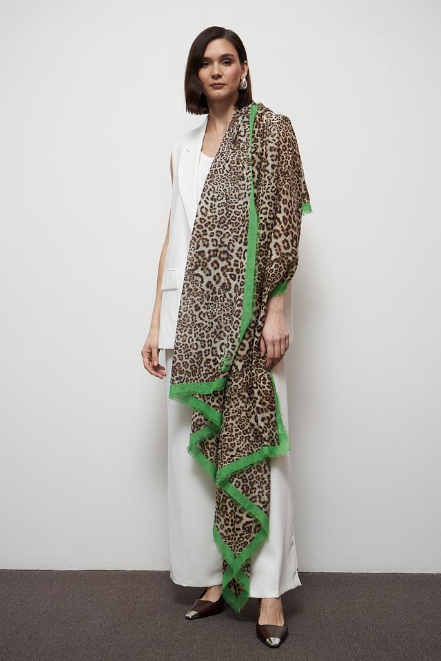 Платок Marc Cain в леопардовый принт с яркой зелёной отделкой станет стильным дополнением к вашему образу. Изготовлен из высококачественного хлопка и шёлка, обеспечивая мягкость и комфорт. Состав: хлопок 72%, шелк 28%