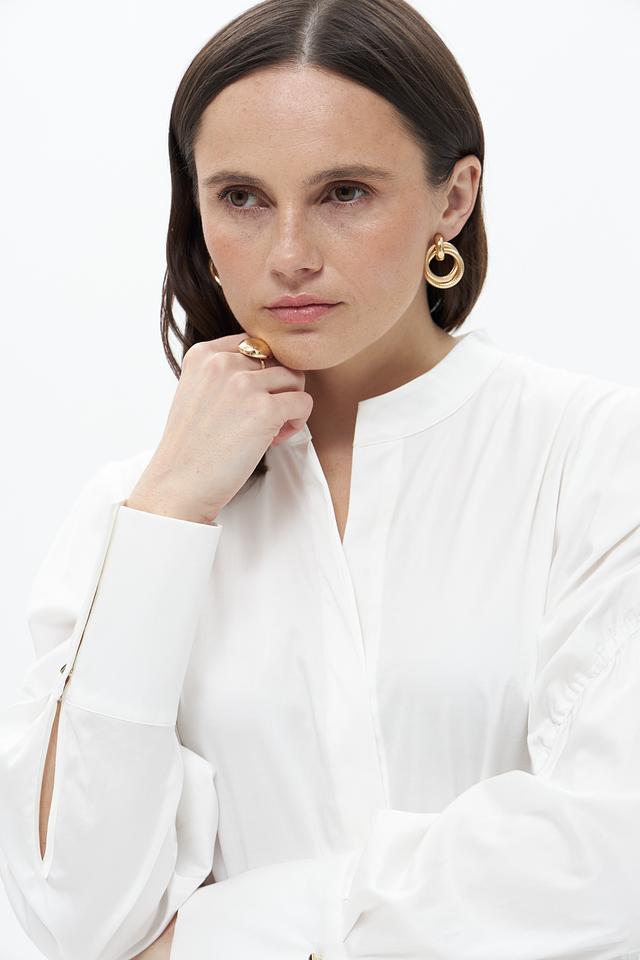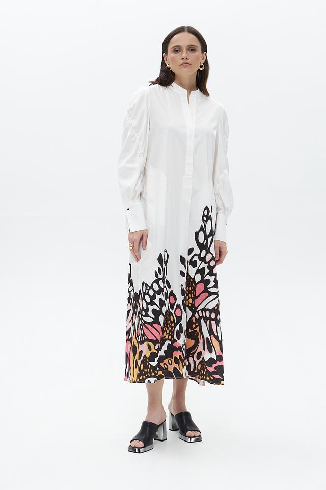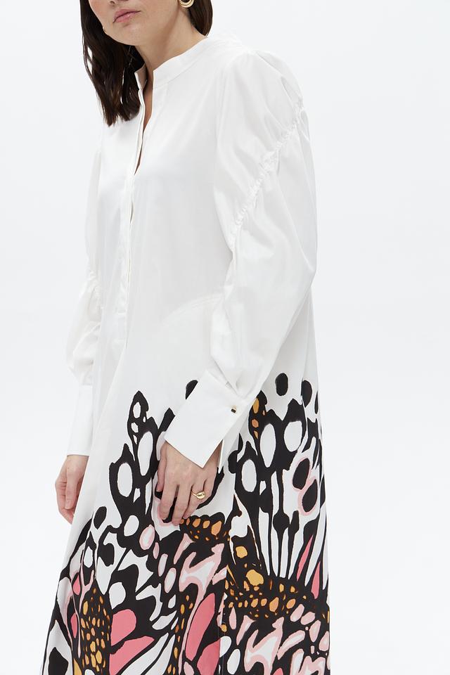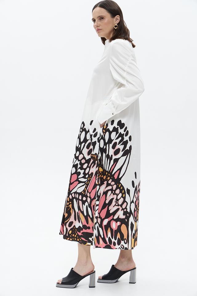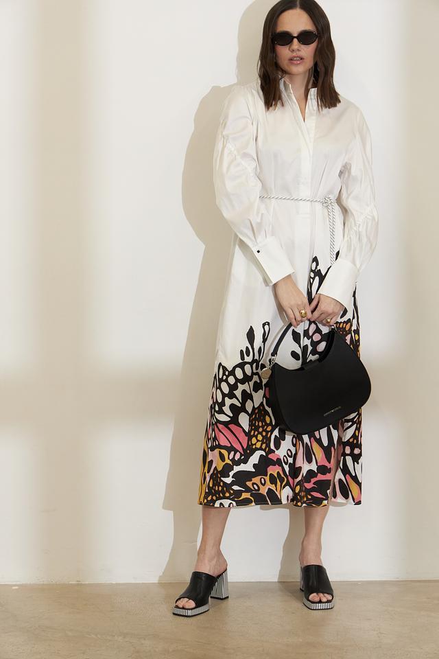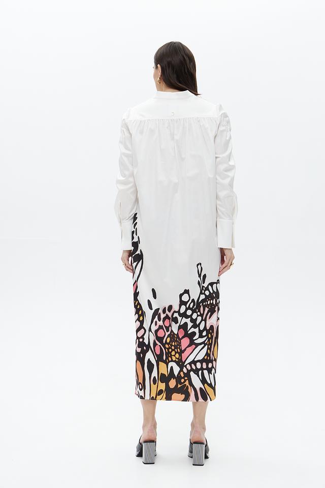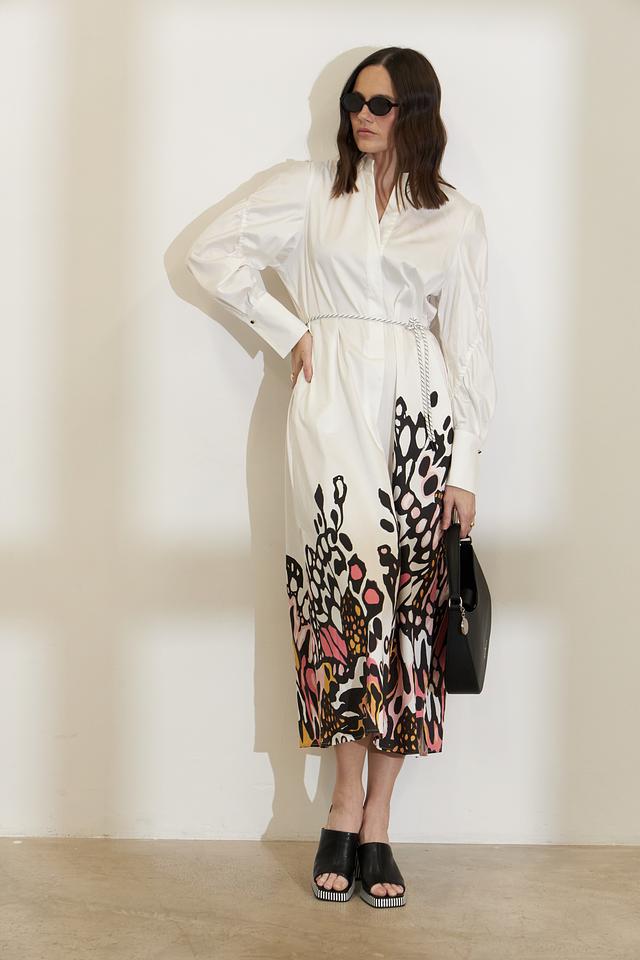 Верх платья выполнен в белом цвете и имеет рубашечный крой с длинными рукавами и воротником. Юбка платья украшена оригинальным цветочным принтом, выполненным в ярких оттенках розового, оранжевого и черного. Платье имеет свободный силуэт, который подчеркивает женственность и элегантность.