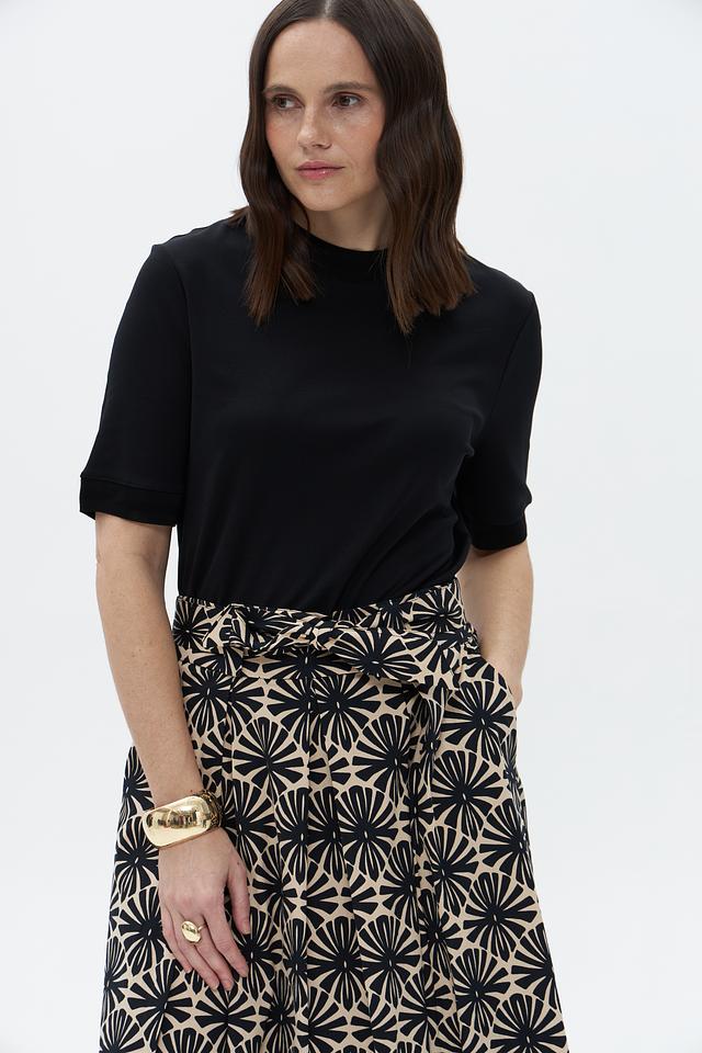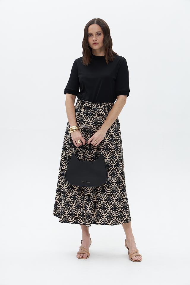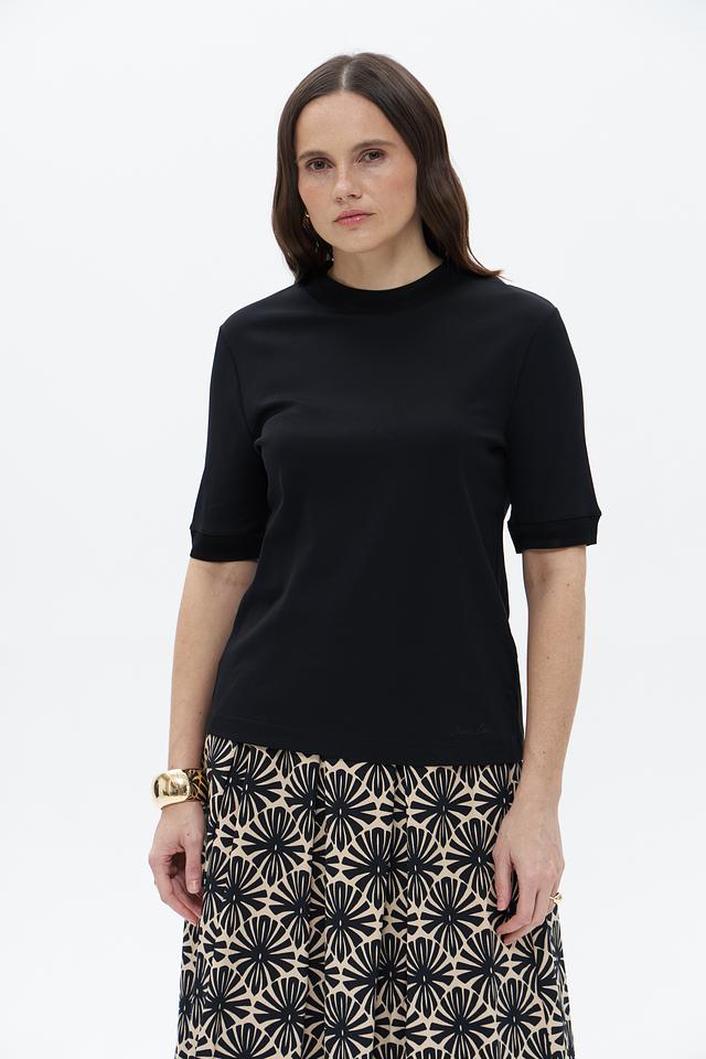 Классический прямой крой и короткий рукав делают эту футболку универсальной и подходящей для различных случаев. Она отлично сочетается с юбками, брюками и джинсами, позволяя создавать разнообразные образы.