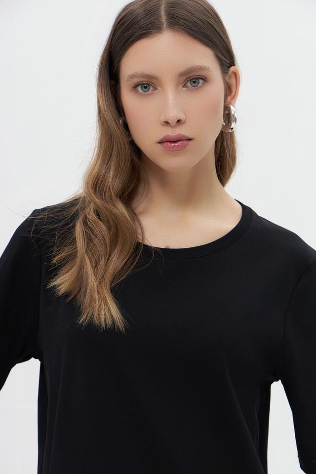 Основной цвет футболки – чёрный, что делает её универсальной и легко сочетаемой с другими элементами одежды. Особый акцент в дизайне – кружевная отделка по нижнему краю, придающая изделию женственность и изысканность.