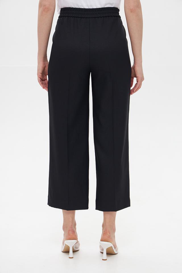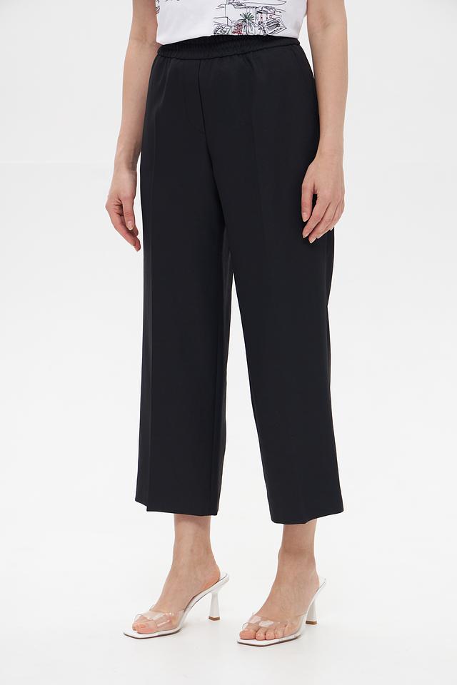 Брюки имеют классический чёрный цвет, который легко сочетается с различными элементами гардероба. Завышенная талия визуально удлиняет ноги и подчеркивает фигуру. Эластичный пояс обеспечивает комфортную посадку и свободу движений.
