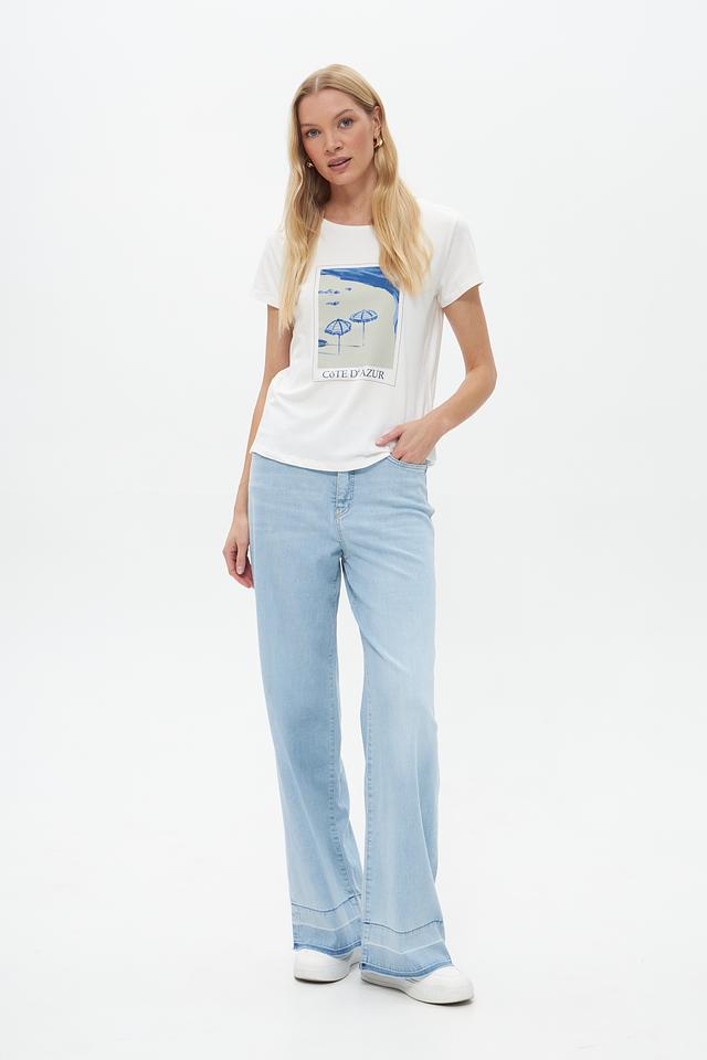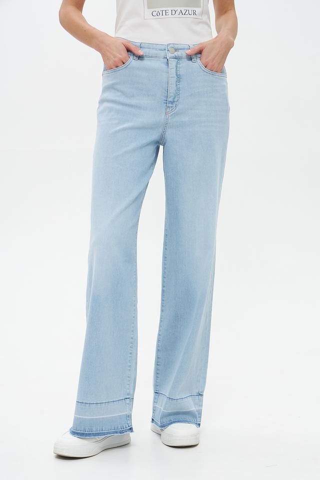 Светло-голубые джинсы Marc Cain свободного кроя с заниженной талией. Модель выполнена из качественного хлопка с добавлением эластана для комфорта и отличной посадки. Оригинальный дизайн дополнен контрастной отделкой по низу. Состав: хлопок 92%, эластомультиэстер 6%, эластан 2%