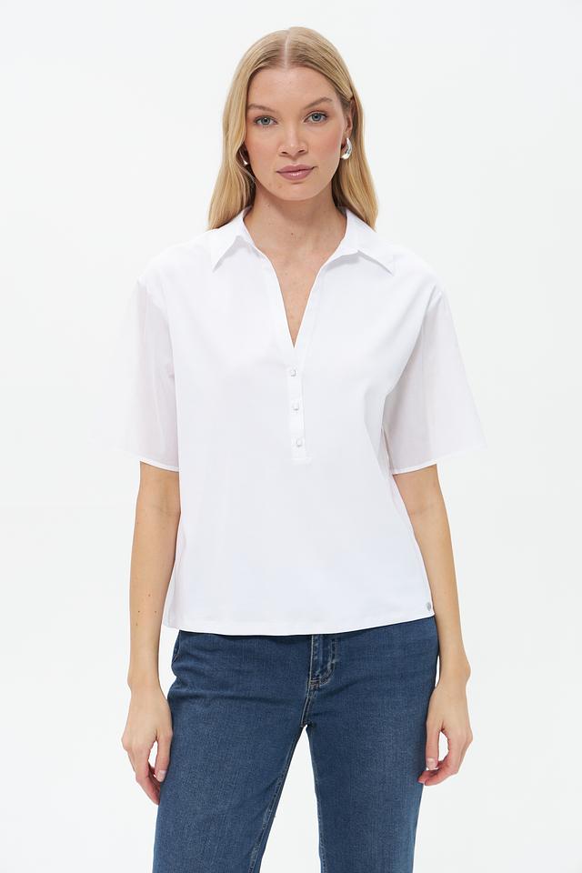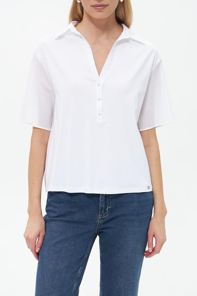 Модель имеет V-образный вырез и короткие рукава, что делает её идеальным выбором для тёплой погоды. Застёжка на пуговицы добавляет функциональности и позволяет регулировать степень открытости выреза.