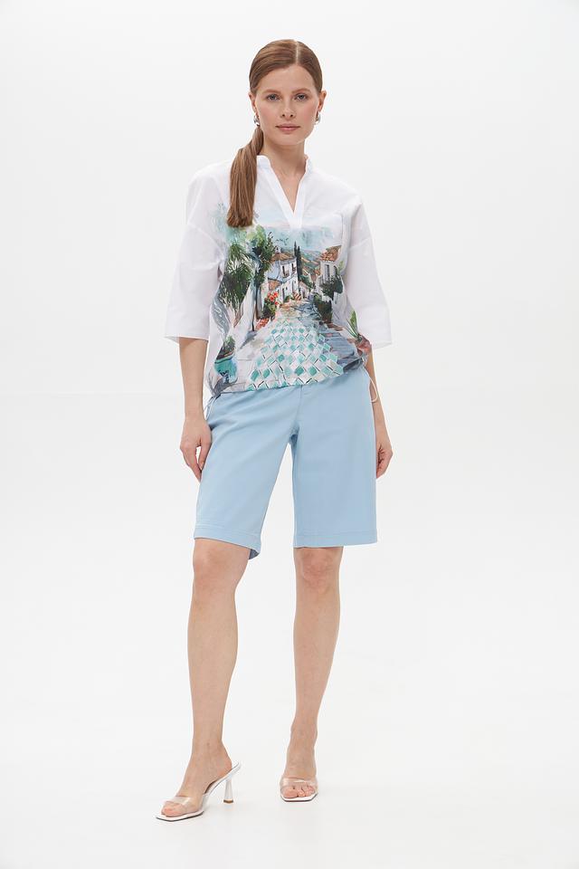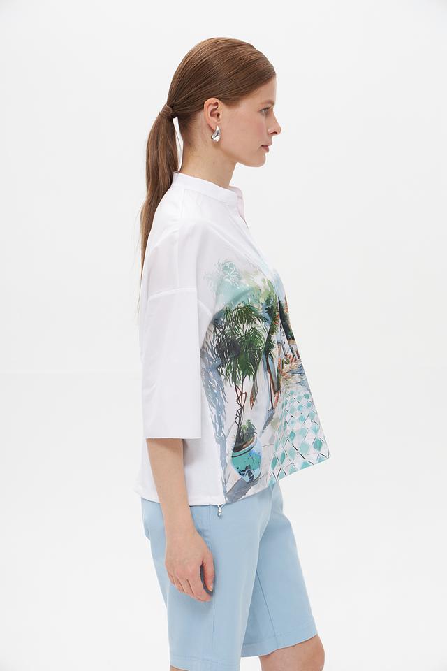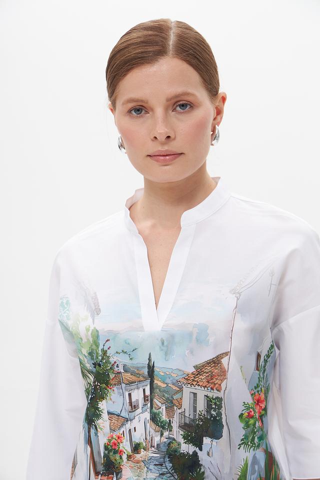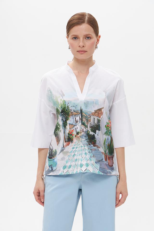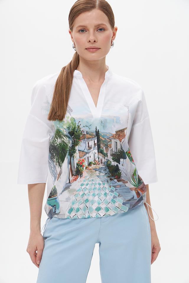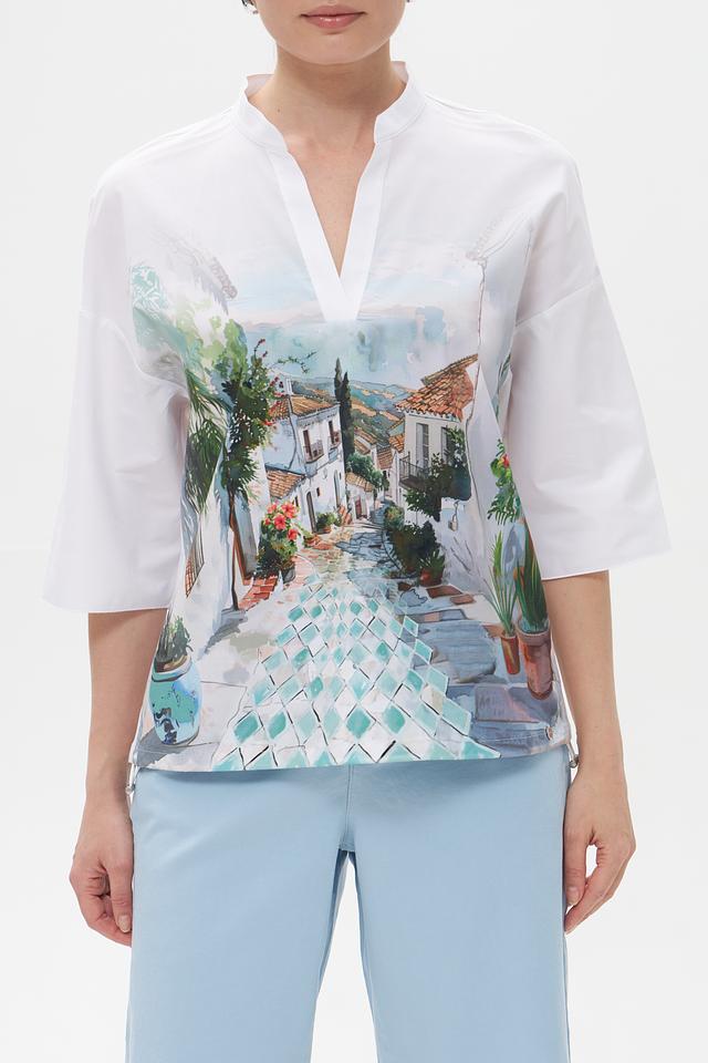 Основной цвет блузы – белый, но ее главным украшением является яркий принт, изображающий живописный городской пейзаж с узкими улочками, домами и зеленью. Принт выполнен в акварельной технике, что придает блузе легкость и воздушность.