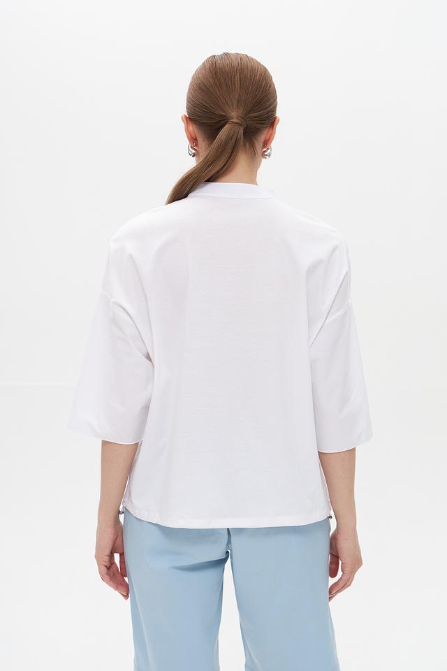 Блуза имеет прямой крой, короткие рукава и V-образный вырез горловины. Она прекрасно сочетается с брюками, юбками и джинсами, создавая стильные и комфортные образы. Состав: 96% хлопок, 4% эластан.