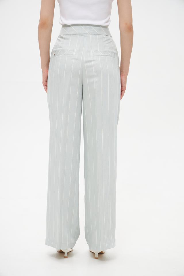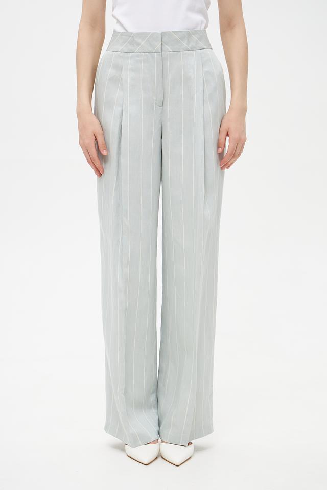Женские брюки палаццо Marc Cain голубого цвета с вертикальной полоской. Изготовлены из вискозы и льна, обеспечивающих комфорт и воздухопроницаемость. Подходят для создания элегантных и стильных образов. Состав: вискоза 58%, лен 42%